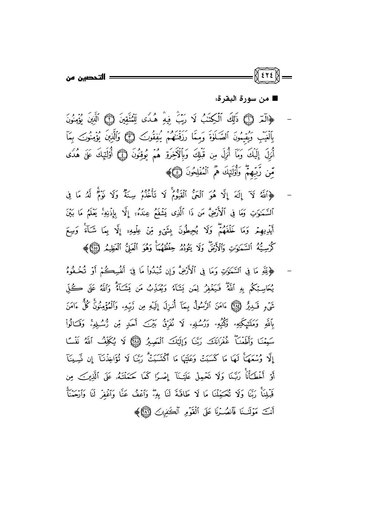 - ... {الم *ذَلِكَ الْكِتَابُ لاَ رَيْبَ فِيهِ هُدَىً لِلْمُتَّقِينَ *الَّذِينَ يُؤْمِنُونَ بِالْغَيْبِ وَيُقِيمُونَ الصَّلاَةَ وَمِمَّا رَزَقْنَاهُمْ يُنْفِقُونَ *وَالَّذِينَ يُؤْمِنُونَ بِمَا أُنْزِلَ إِلَيْكَ وَمَا أُنْزِلَ مِنْ قَبْلِكَ وَبِالآخِرَةِ هُمْ يُوقِنُونَ *أُولَئِكَ عَلَى هُدَىً مِنْ رَبِّهِمْ وَأُولَئِكَ هُمُ الْمُفْلِحُونَ *}