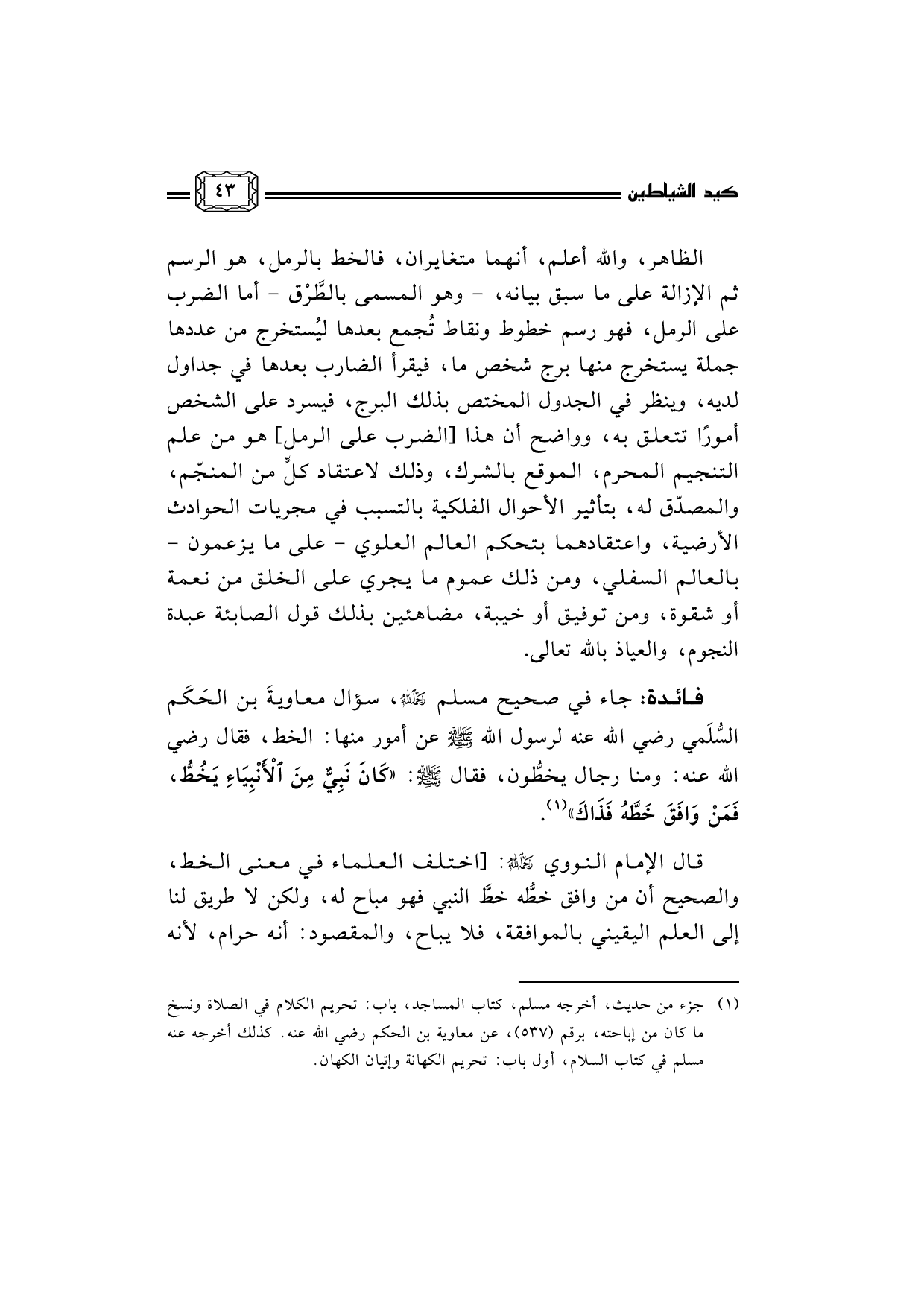 فائدة: جاء في صحيح مسلم رحمه الله، سؤال معاويةَ بن الحَكَم السُّلَمي رضي الله عنه لرسول الله صلى الله عليه وسلم عن أمور منها: الخط، فقال رضي الله عنه: ومنا رجال يخطُّون، فقال صلى الله عليه وسلم: «كَانَ نَبِيٌّ مِنَ الأَْنْبِيَاءِ يَخُطُّ، فَمَنْ وَافَقَ خَطَّهُ فَذَاكَ» (¬1) .