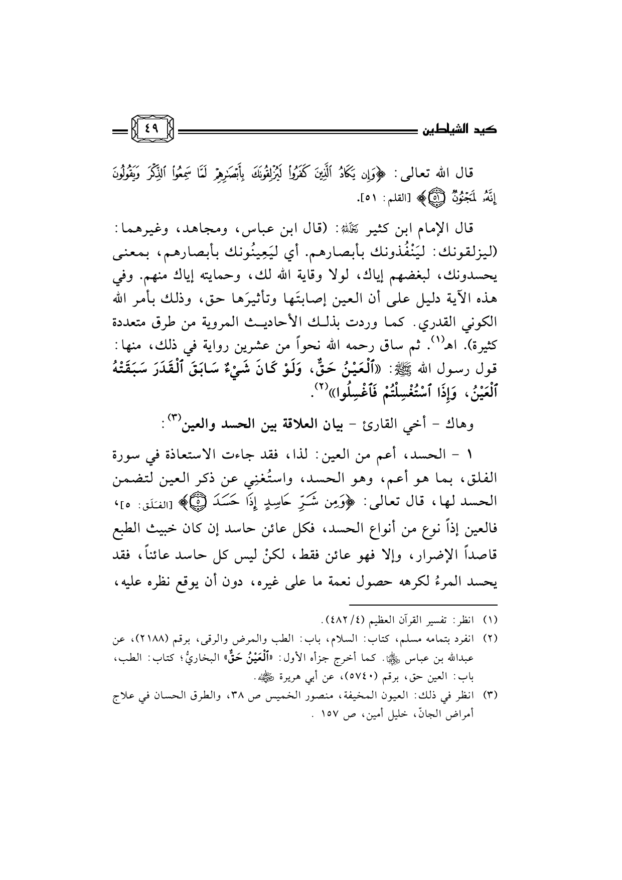 قال الإمام ابن كثير رحمه الله: (قال ابن عباس، ومجاهد، وغيرهما: (ليزلقونك: ليَنْفُذونك بأبصارهم. أي ليَعِينُونك بأبصارهم، بمعنى يحسدونك، لبغضهم إياك، لولا وقاية الله لك، وحمايته إياك منهم. وفي هذه الآية دليل على أن العين إصابتَها وتأثيرَها حق، وذلك بأمر الله الكوني القدري. كما وردت بذلك الأحاديث المروية من طرق متعددة كثيرة) . اهـ (¬1) . ثم ساق رحمه الله نحواً من عشرين رواية في ذلك، منها: قول رسول الله صلى الله عليه وسلم: الْعَيْنُ حَقٌّ، وَلَوْ كَانَ شَيْءٌ سَابَقَ الْقَدَرَ سَبَقَتْهُ الْعَيْنُ، وَإِذَا اسْتُغْسِلْتُمْ فَاغْسِلُوا (¬2) .