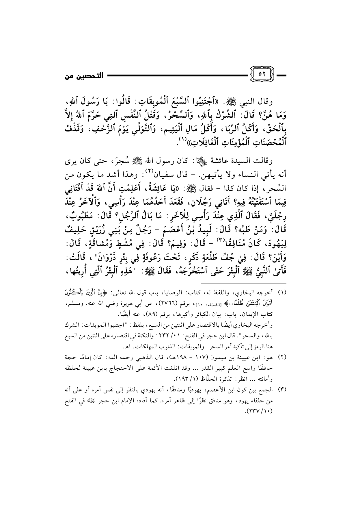 وأخرجه البخاري أيضًا بالاقتصار على اثنتين من السبع، بلفظ: "اجتنبوا الموبقات: الشرك بالله، والسحر". قال ابن حجر في الفتح: 01/232: والنكتة في اقتصاره على اثنتين من السبع هنا الرمز إلى تأكيد أمر السحر. والموبقات: الذنوب المهلكات. اهـ.