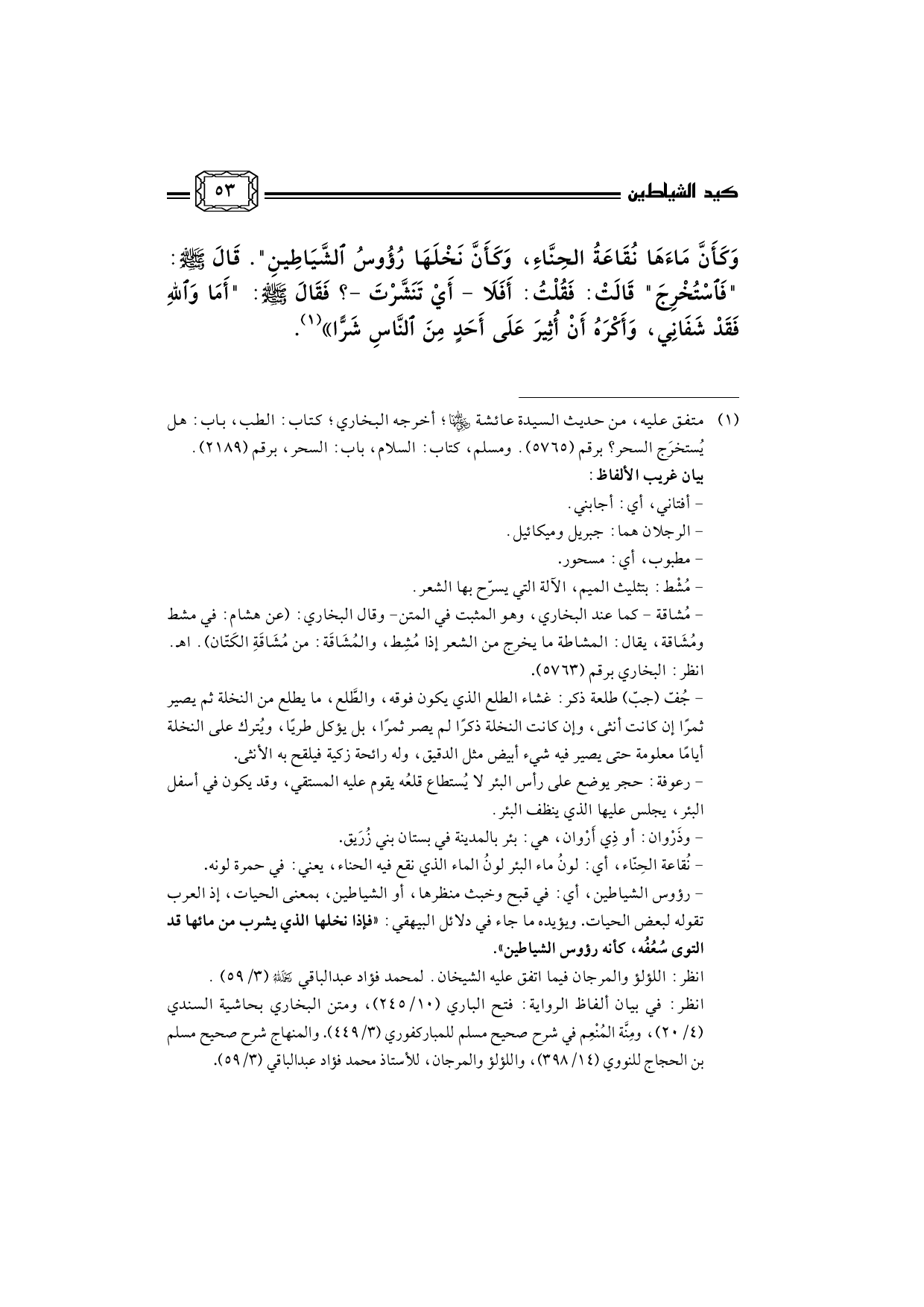 (¬1) متفق عليه، من حديث السيدة عائشة رضي الله عنها؛ أخرجه البخاري؛ كتاب: الطب، باب: هل يُستخرَج السحر؟ برقم (5765) . ومسلم، كتاب: السلام، باب: السحر، برقم (2189) . ... بيان غريب الألفاظ: ... - أفتاني، أي: أجابني. ... - الرجلان هما: جبريل وميكائيل. ... - مطبوب، أي: مسحور. ... - مُشْط: بتثليث الميم، الآلة التي يسرّح بها الشعر. ... - مُشاقة - كما عند البخاري، وهو المثبت في المتن- وقال البخاري: (عن هشام: في مشط ومُشَاقة، يقال: المشاطة ما يخرج من الشعر إذا مُشِط، والمُشَاقَة: من مُشَاقَةِ الكَتّان) . اهـ. انظر: البخاري برقم (5763) . ... - جُفّ (جبّ) طلعة ذكر: غشاء الطلع الذي يكون فوقه، والطَّلع، ما يطلع من النخلة ثم يصير ثمرًا إن كانت أنثى، وإن كانت النخلة ذكرًا لم يصر ثمرًا، بل يؤكل طريًا، ويُترك على النخلة أيامًا معلومة حتى يصير فيه شيء أبيض مثل الدقيق، وله رائحة زكية فيلقح به الأنثى. ... - رعوفة: حجر يوضع على رأس البئر لا يُستطاع قلعُه يقوم عليه المستقي، وقد يكون في أسفل البئر، يجلس عليها الذي ينظف البئر. ... - وذَرْوان: أو ذِي أَرْوان، هي: بئر بالمدينة في بستان بني زُرَيق. ... - نُقاعة الحِنّاء، أي: لونُ ماء البئر لونُ الماء الذي نقع فيه الحناء، يعني: في حمرة لونه. ... - رؤوس الشياطين، أي: في قبح وخبث منظرها، أو الشياطين، بمعنى الحيات، إذ العرب تقوله لبعض الحيات. ويؤيده ما جاء في دلائل البيهقي: «فإذا نخلها الذي يشرب من مائها قد التوى سُعُفُه، كأنه رؤوس الشياطين» . ... انظر: اللؤلؤ والمرجان فيما اتفق عليه الشيخان. لمحمد فؤاد عبد الباقي رحمه الله (3/59) . ... انظر: في بيان ألفاظ الرواية: فتح الباري (10/245) ، ومتن البخاري بحاشية السندي (4/20) ، ومِنَّة المُنْعِم في شرح صحيح مسلم للمباركفوري (3/449) . والمنهاج شرح صحيح مسلم بن الحجاج للنووي (14/398) ، واللؤلؤ والمرجان، للأستاذ محمد فؤاد عبد الباقي (3/59) .