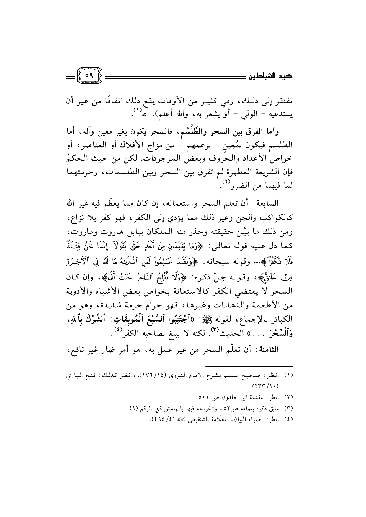 السابعة: أن تعلم السحر واستعماله، إن كان مما يعظّم فيه غير الله كالكواكب والجن وغير ذلك مما يؤدي إلى الكفر، فهو كفر بلا نزاع، ومن ذلك ما بيَّن حقيقته وحذر منه الملكان ببابل هاروت وماروت، كما دل عليه قوله تعالى: {وَمَا ... } ، وقوله سبحانه: {وَلَقَدْ ... } ، وقوله جلّ ذكره: {وَلاَ ... } ، وإن كان السحر لا يقتضي الكفر كالاستعانة بخواص بعض الأشياء والأدوية من الأطعمة والدهانات وغيرها، فهو حرام حرمة شديدة، وهو من الكبائر بالإجماع، لقوله صلى الله عليه وسلم: اجْتَنِبُوا السَّبْعَ الْمُوبِقَاتِ: الشِّرْكَ بِاللهِ، وَالْسِّحْرَ ... الحديث (¬3) . لكنه لا يبلغ بصاحبه الكفر (¬4) .