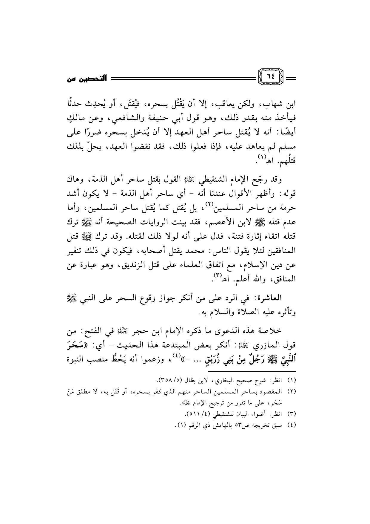وقد رجّح الإمام الشنقيطي رحمه الله القول بقتل ساحر أهل الذمة، وهاك قوله: وأظهر الأقوال عندنا أنه - أي ساحر أهل الذمة - لا يكون أشد حرمة من ساحر المسلمين (¬2) ، بل يُقتل كما يُقتل ساحر المسلمين، وأما عدم قتله صلى الله عليه وسلم لابن الأعصم، فقد بينت الروايات الصحيحة أنه صلى الله عليه وسلم ترك قتله اتقاء إثارة فتنة، فدل على أنه لولا ذلك لقتله. وقد ترك صلى الله عليه وسلم قتل المنافقين لئلا يقول الناس: محمد يقتل أصحابه، فيكون في ذلك تنفير عن دين الإسلام، مع اتفاق العلماء على قتل الزنديق، وهو عبارة عن المنافق، والله أعلم. اهـ (¬3) .