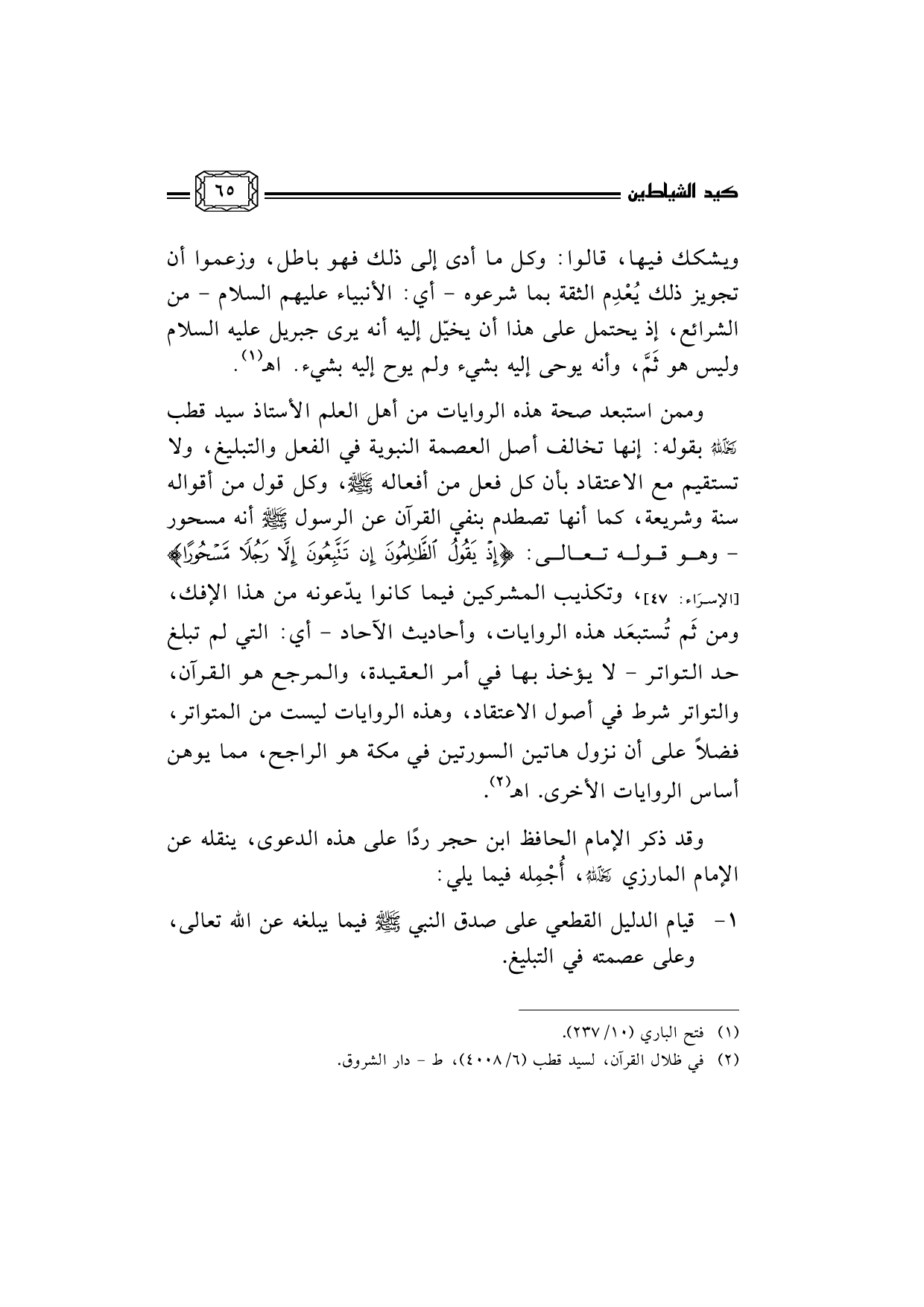 وممن استبعد صحة هذه الروايات من أهل العلم الأستاذ سيد قطب رحمه الله بقوله: إنها تخالف أصل العصمة النبوية في الفعل والتبليغ، ولا تستقيم مع الاعتقاد بأن كل فعل من أفعاله صلى الله عليه وسلم، وكل قول من أقواله سنة وشريعة، كما أنها تصطدم بنفي القرآن عن الرسول صلى الله عليه وسلم أنه مسحور - وهو قوله تعالى: [الإسرَاء: 47] {إِذْ يَقُولُ الظَّالِمُونَ إِنْ تَتَّبِعُونَ إِلاَّ رَجُلاً مَسْحُورًا} ، وتكذيب المشركين فيما كانوا يدّعونه من هذا الإفك، ومن ثَم تُستبعَد هذه الروايات، وأحاديث الآحاد - أي: التي لم تبلغ حد التواتر - لا يؤخذ بها في أمر العقيدة، والمرجع هو القرآن، والتواتر شرط في أصول الاعتقاد، وهذه الروايات ليست من المتواتر، فضلاً على أن نزول هاتين السورتين في مكة هو الراجح، مما يوهن أساس الروايات الأخرى. اهـ (¬2) .
