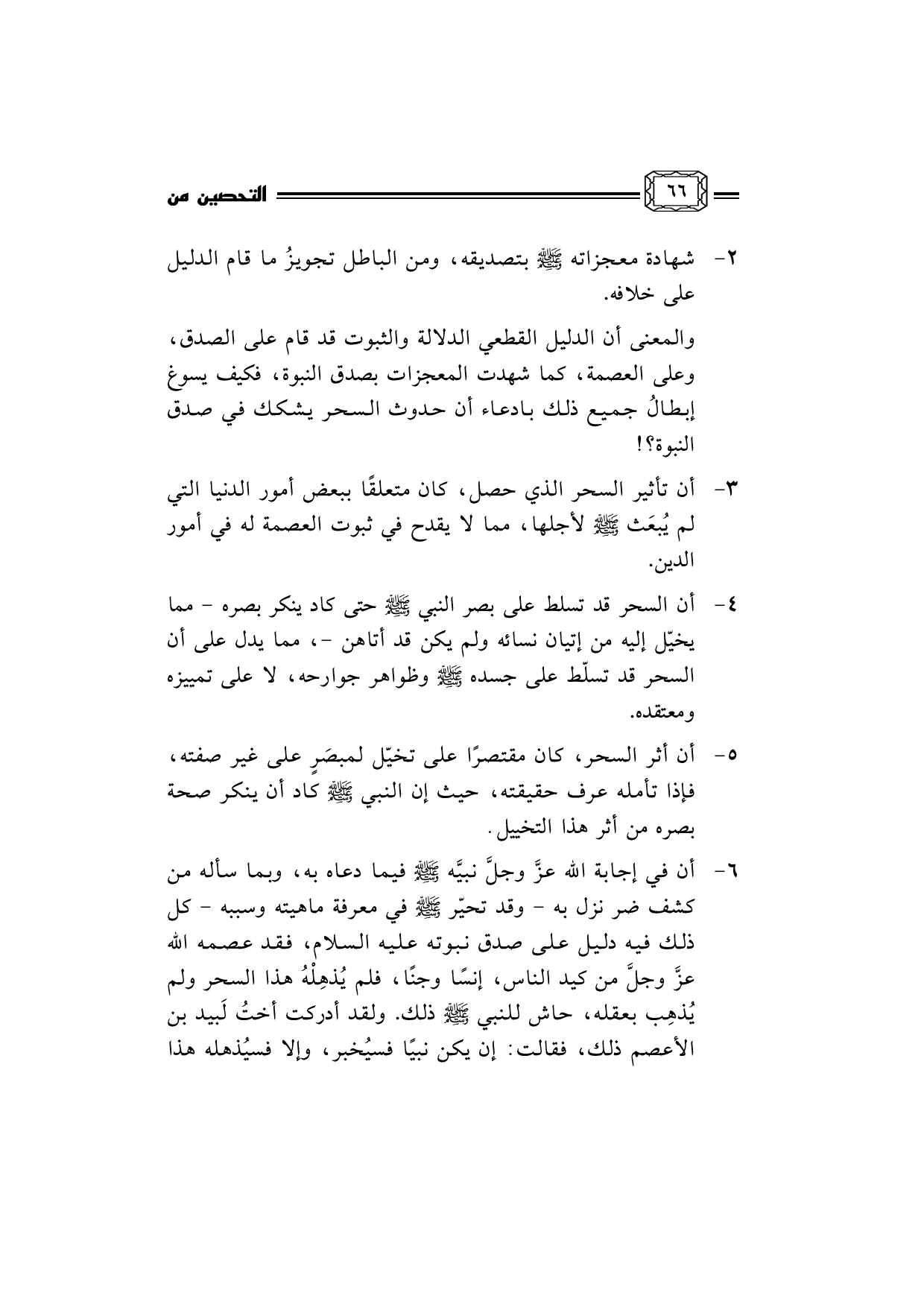 6- ... أن في إجابة الله عزَّ وجلَّ نبيَّه صلى الله عليه وسلم فيما دعاه به، وبما سأله من كشف ضر نزل به - وقد تحيّر صلى الله عليه وسلم في معرفة ماهيته وسببه - كل ذلك فيه دليل على صدق نبوته عليه السلام، فقد عصمه الله عزَّ وجلَّ من كيد الناس، إنسًا وجنًا، فلم يُذهِلْهُ هذا السحر ولم يُذهِب بعقله، حاش للنبي صلى الله عليه وسلم ذلك. ولقد أدركت أختُ لَبيد بن الأعصم ذلك، فقالت: إن يكن نبيًا فسيُخبر، وإلا فسيُذهله هذا