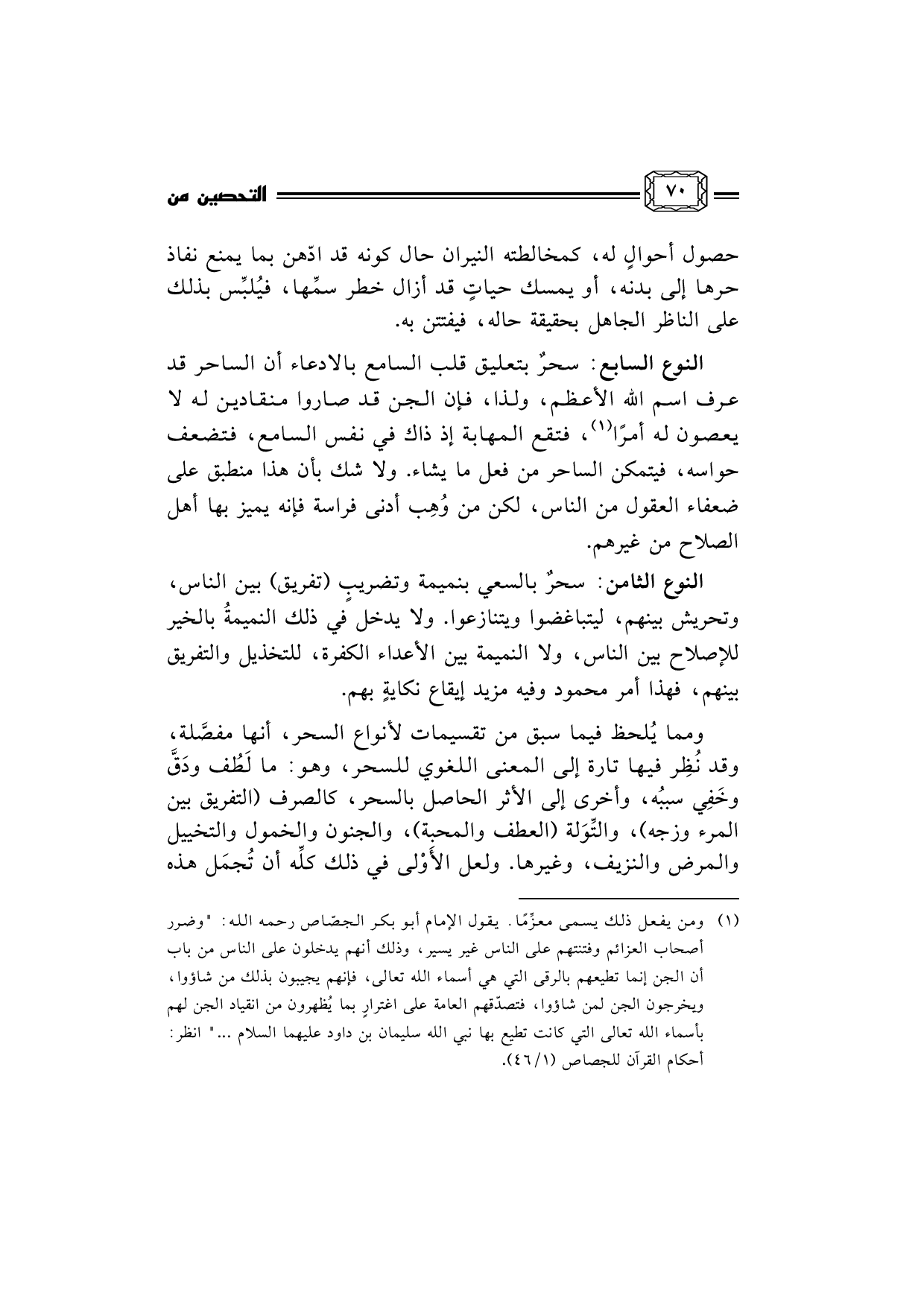 النوع السابع: سحرٌ بتعليق قلب السامع بالادعاء أن الساحر قد عرف اسم الله الأعظم، ولذا، فإن الجن قد صاروا منقادين له لا يعصون له أمرًا (¬1) ، فتقع المهابة إذ ذاك في نفس السامع، فتضعف حواسه، فيتمكن الساحر من فعل ما يشاء. ولا شك بأن هذا منطبق على ضعفاء العقول من الناس، لكن من وُهِب أدنى فراسة فإنه يميز بها أهل الصلاح من غيرهم.