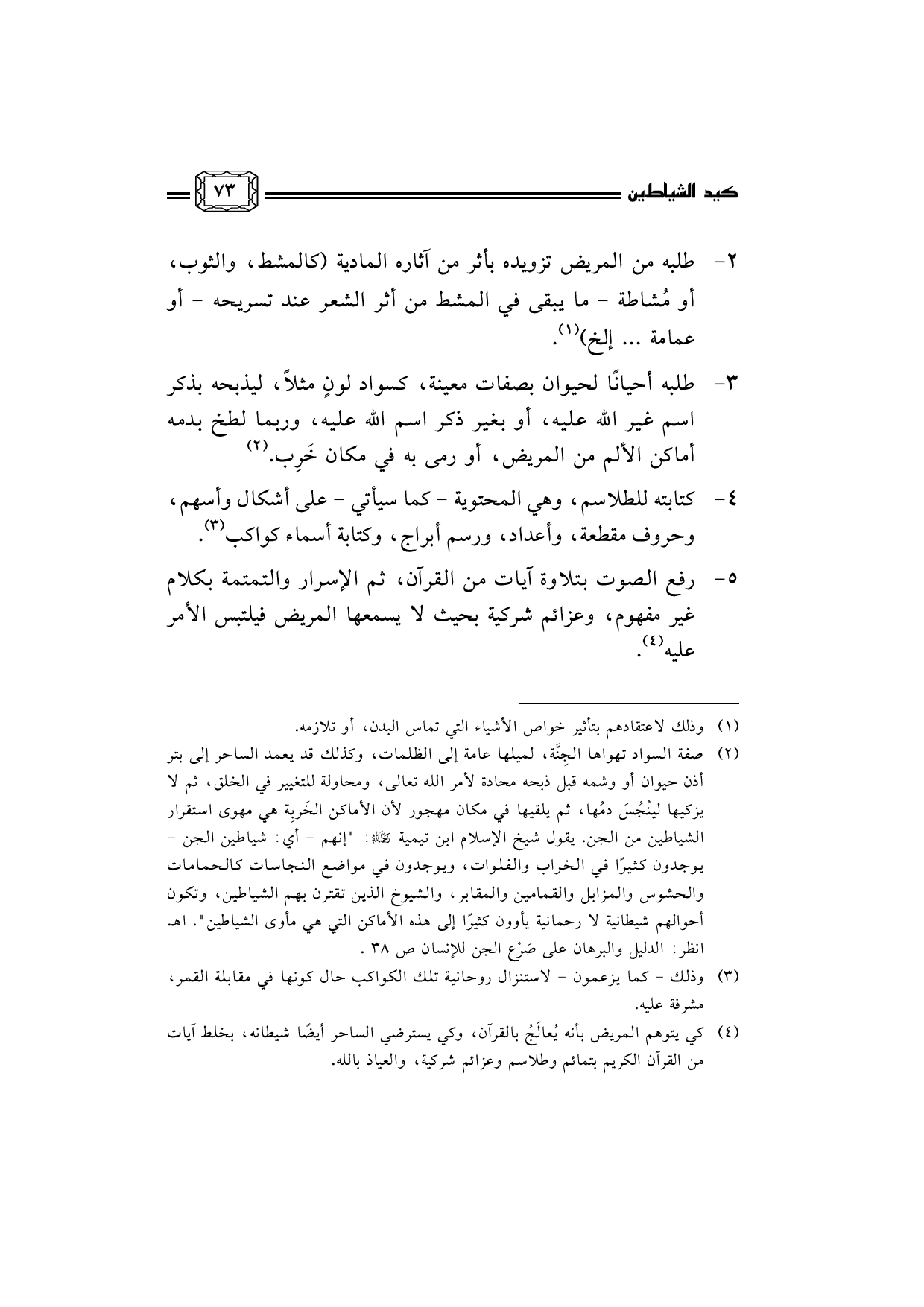 (¬4) كي يتوهم المريض بأنه يُعالَجُ بالقرآن، وكي يسترضي الساحر أيضًا شيطانه، بخلط آيات من القرآن الكريم بتمائم وطلاسم وعزائم شركية، والعياذ بالله.
