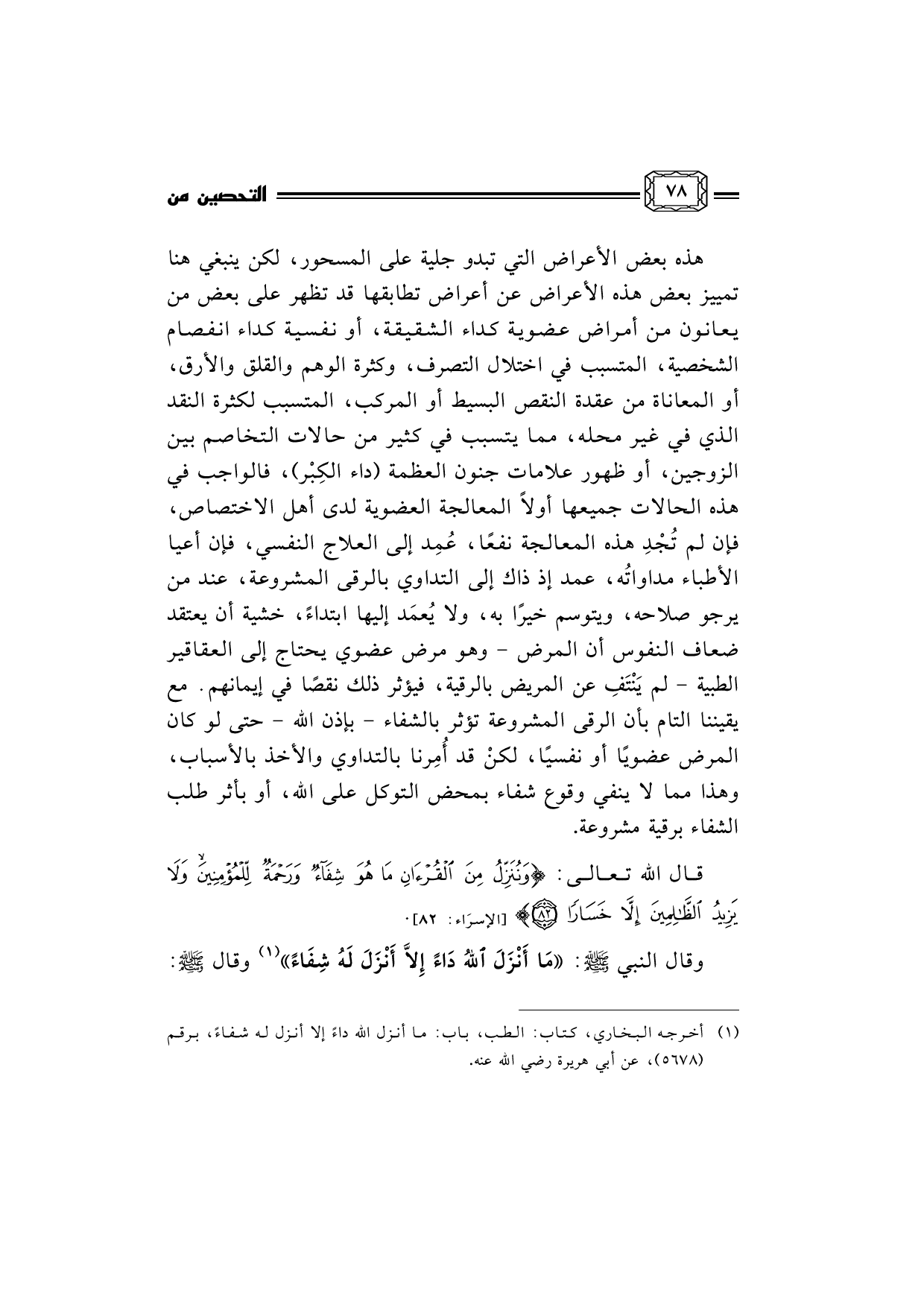 هذه بعض الأعراض التي تبدو جلية على المسحور، لكن ينبغي هنا تمييز بعض هذه الأعراض عن أعراض تطابقها قد تظهر على بعض من يعانون من أمراض عضوية كداء الشقيقة، أو نفسية كداء انفصام الشخصية، المتسبب في اختلال التصرف، وكثرة الوهم والقلق والأرق، أو المعاناة من عقدة النقص البسيط أو المركب، المتسبب لكثرة النقد الذي في غير محله، مما يتسبب في كثير من حالات التخاصم بين الزوجين، أو ظهور علامات جنون العظمة (داء الكِبْر) ، فالواجب في هذه الحالات جميعها أولاً المعالجة العضوية لدى أهل الاختصاص، فإن لم تُجْدِ هذه المعالجة نفعًا، عُمِد إلى العلاج النفسي، فإن أعيا الأطباء مداواتُه، عمد إذ ذاك إلى التداوي بالرقى المشروعة، عند من يرجو صلاحه، ويتوسم خيرًا به، ولا يُعمَد إليها ابتداءً، خشية أن يعتقد ضعاف النفوس أن المرض - وهو مرض عضوي يحتاج إلى العقاقير الطبية - لم يَنْتَفِ عن المريض بالرقية، فيؤثر ذلك نقصًا في إيمانهم. مع يقيننا التام بأن الرقى المشروعة تؤثر بالشفاء - بإذن الله - حتى لو كان المرض عضويًا أو نفسيًا، لكنْ قد أُمِرنا بالتداوي والأخذ بالأسباب، وهذا مما لا ينفي وقوع شفاء بمحض التوكل على الله، أو بأثر طلب الشفاء برقية مشروعة.