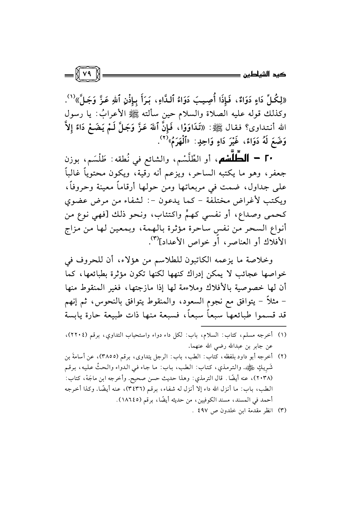 20- الطِّلَّسْم، أو الطِّلَّسْم، والشائع في نُطقه: طَلْسَم، بوزن جعفر، وهو ما يكتبه الساحر، ويزعم أنه رقية، ويكون محتوياً غالباً على جداول، ضمت في مربعاتها ومن حولها أرقاماً معينة وحروفاً، ويكتب لأغراض مختلفة - كما يدعون -: لشفاء من مرض عضوي كحمى وصداع، أو نفسي كهمٍّ واكتئاب، ونحو ذلك [فهي نوع من أنواع السحر من نفسٍ ساحرة مؤثرة بالهمة، وبمعين لها من مزاج الأفلاك أو العناصر، أو خواص الأعداد] (¬3) .