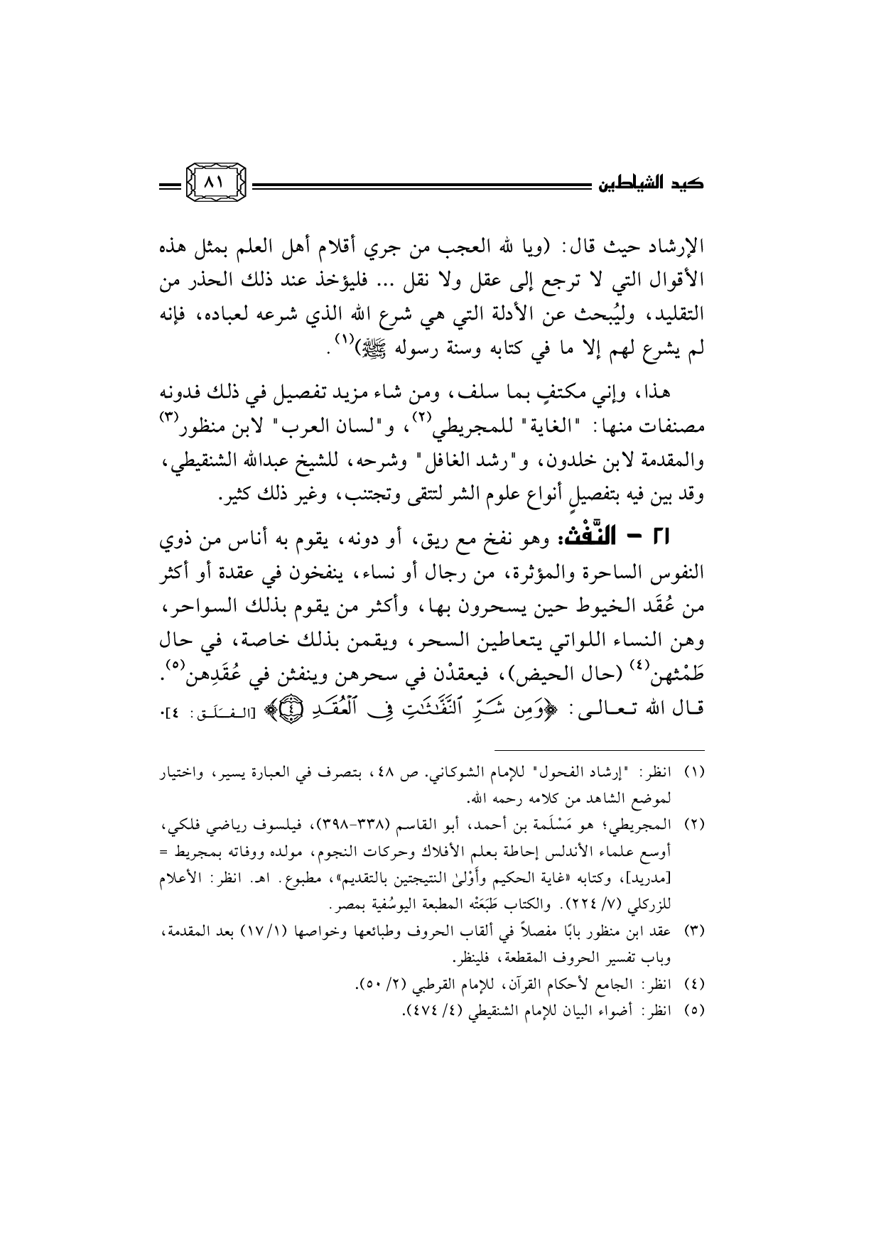 هذا، وإني مكتفٍ بما سلف، ومن شاء مزيد تفصيل في ذلك فدونه مصنفات منها: "الغاية" للمجريطي (¬2) ، و"لسان العرب" لابن منظور (¬3) والمقدمة لابن خلدون، و"رشد الغافل" وشرحه، للشيخ عبد الله الشنقيطي، وقد بين فيه بتفصيلٍ أنواع علوم الشر لتتقى وتجتنب، وغير ذلك كثير.