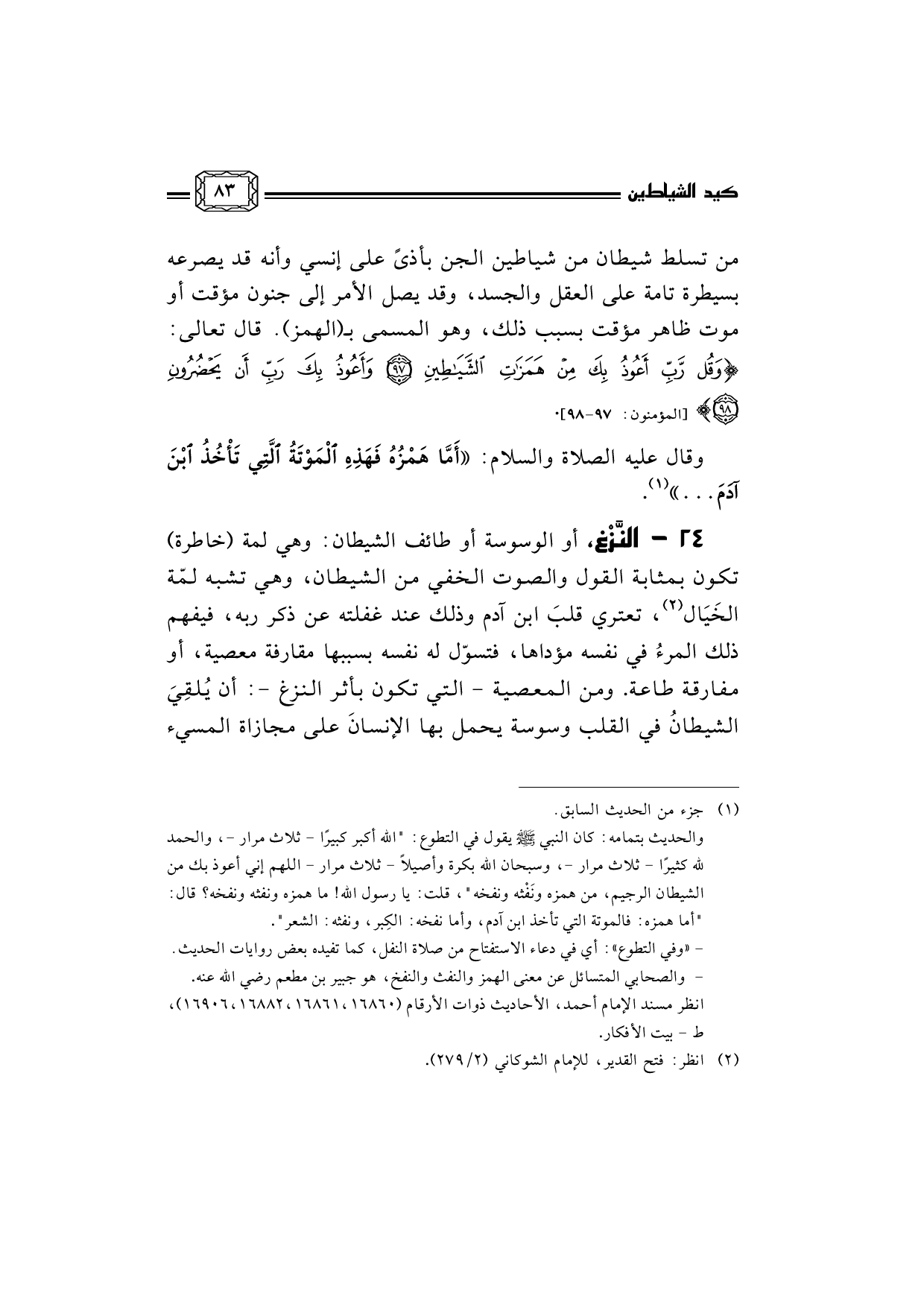24- النَّزْغ، أو الوسوسة أو طائف الشيطان: وهي لمة (خاطرة) تكون بمثابة القول والصوت الخفي من الشيطان، وهي تشبه لمّة الخَيَال (¬2) ، تعتري قلبَ ابن آدم وذلك عند غفلته عن ذكر ربه، فيفهم ذلك المرءُ في نفسه مؤداها، فتسوّل له نفسه بسببها مقارفة معصية، أو مفارقة طاعة. ومن المعصية - التي تكون بأثر النزغ -: أن يُلقِيَ الشيطانُ في القلب وسوسة يحمل بها الإنسانَ على مجازاة المسيء