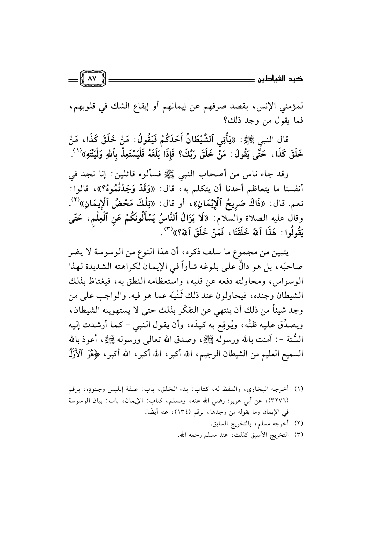 (¬1) أخرجه البخاري، واللفظ له، كتاب: بدء الخلق، باب: صفة إبليس وجنودِه، برقم (3276) ، عن أبي هريرة رضي الله عنه، ومسلم، كتاب: الإيمان، باب: بيان الوسوسة في الإيمان وما يقوله من وجدها، برقم (134) ، عنه أيضًا.