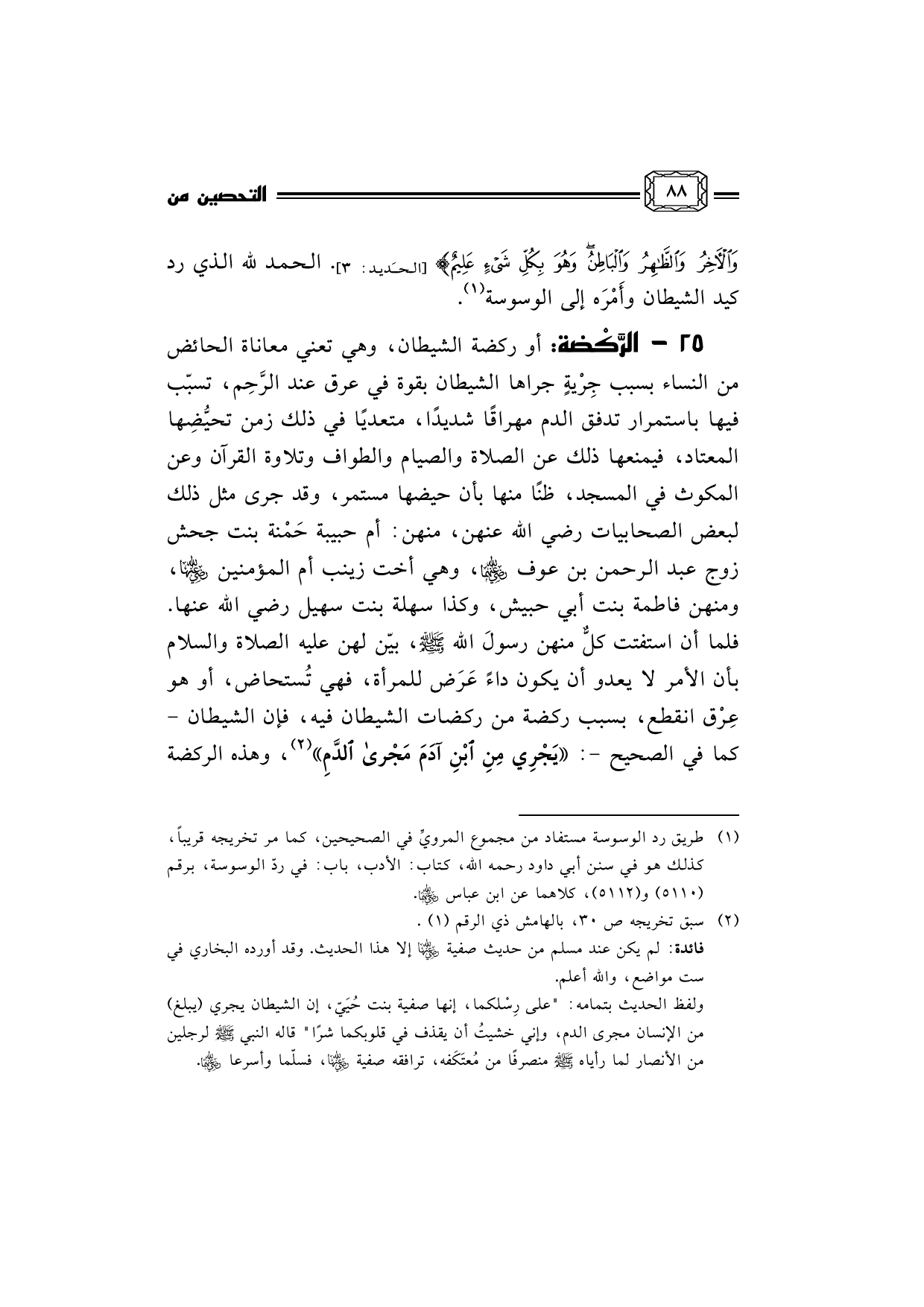 25 - الرَّكْضة: أو ركضة الشيطان، وهي تعني معاناة الحائض من النساء بسبب جِرْيةٍ جراها الشيطان بقوة في عرق عند الرَّحِم، تسبّب فيها باستمرار تدفق الدم مهراقًا شديدًا، متعديًا في ذلك زمن تحيُّضِها المعتاد، فيمنعها ذلك عن الصلاة والصيام والطواف وتلاوة القرآن وعن المكوث في المسجد، ظنًا منها بأن حيضها مستمر، وقد جرى مثل ذلك لبعض الصحابيات رضي الله عنهن، منهن: أم حبيبة حَمْنة بنت جحش زوج عبد الرحمن بن عوف رضي الله عنهما، وهي أخت زينب أم المؤمنين رضي الله عنها، ومنهن فاطمة بنت أبي حبيش، وكذا سهلة بنت سهيل رضي الله عنها. فلما أن استفتت كلٌّ منهن رسولَ الله صلى الله عليه وسلم، بيّن لهن عليه الصلاة والسلام بأن الأمر لا يعدو أن يكون داءً عَرَض للمرأة، فهي تُستحاض، أو هو عِرْق انقطع، بسبب ركضة من ركضات الشيطان فيه، فإن الشيطان - كما في الصحيح -: يَجْرِي مِنِ ابْنِ آدَمَ مَجْرى الدَّمِ (¬2) ، وهذه الركضة