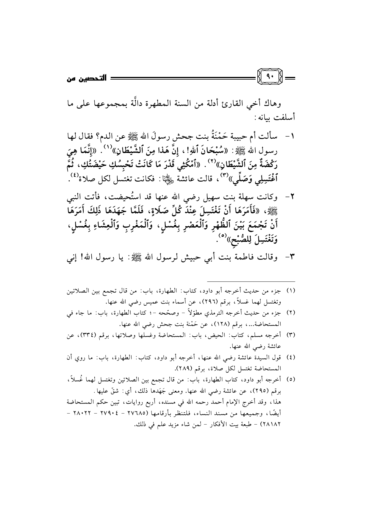 (¬5) أخرجه أبو داود، كتاب الطهارة، باب: من قال تجمع بين الصلاتين وتغتسل لهما غُسلاً، برقم (295) ، عن عائشة رضي الله عنها. ومعنى جَهَدها ذلك، أي: شقّ عليها. ... هذا، وقد أخرج الإمام أحمد رحمه الله في مسنده، أربع روايات، تبين حكم المستحاضة أيضًا، وجميعها من مسند النساء، فلتنظر بأرقامها (27685 - 27904 - 28022 - 28182) - طبعة بيت الأفكار - لمن شاء مزيد علم في ذلك.