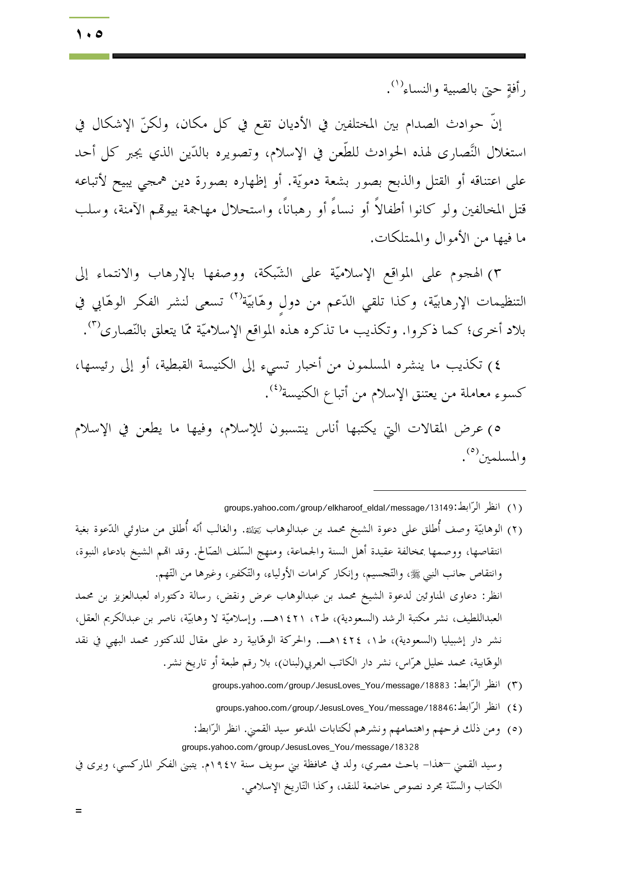 3) الهجوم على المواقع الإسلاميّة على الشّبكة، ووصفها بالإرهاب والانتماء إلى التنظيمات الإرهابيّة، وكذا تلقي الدّعم من دولٍ وهّابيّة (¬2) تسعى لنشر الفكر الوهّابي في بلاد أخرى؛ كما ذكروا. وتكذيب ما تذكره هذه المواقع الإسلاميّة ممّا يتعلق بالنّصارى (¬3).