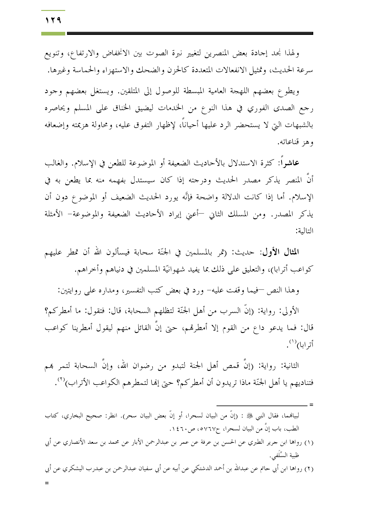 عاشراً: كثرة الاستدلال بالأحاديث الضعيفة أو الموضوعة للطعن في الإسلام. والغالب أنَّ المنصر يذكر مصدر الحديث ودرجته إذا كان سيستدل بفهمه منه بما يطعن به في الإسلام. أما إذا كانت الدلالة واضحة فإنَّه يورد الحديث الضعيف أو الموضوع دون أن يذكر المصدر. ومن المسلك الثاني -أعني إيراد الأحاديث الضعيفة والموضوعة- الأمثلة التالية: