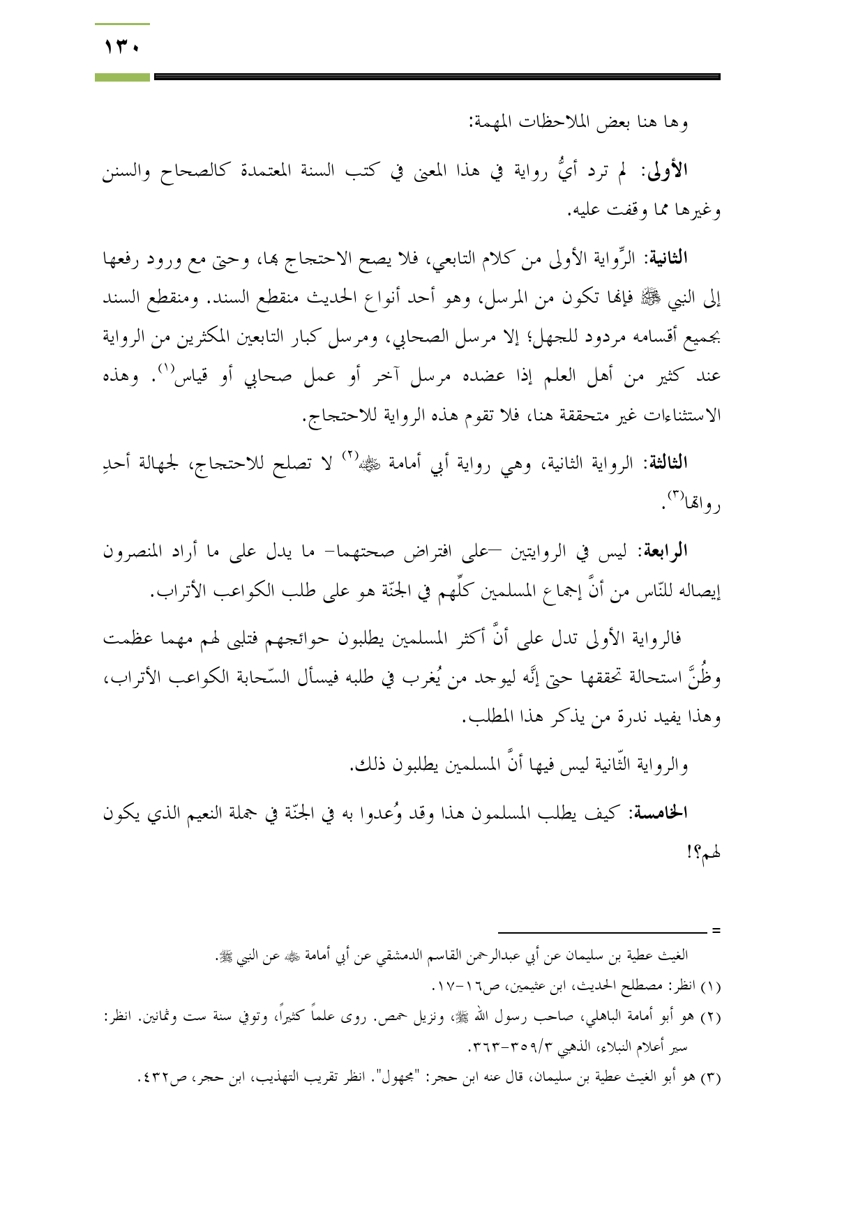 الثالثة: الرواية الثانية، وهي رواية أبي أمامة - رضي الله عنه - (¬2) لا تصلح للاحتجاج، لجهالة أحدِ رواتها (¬3).