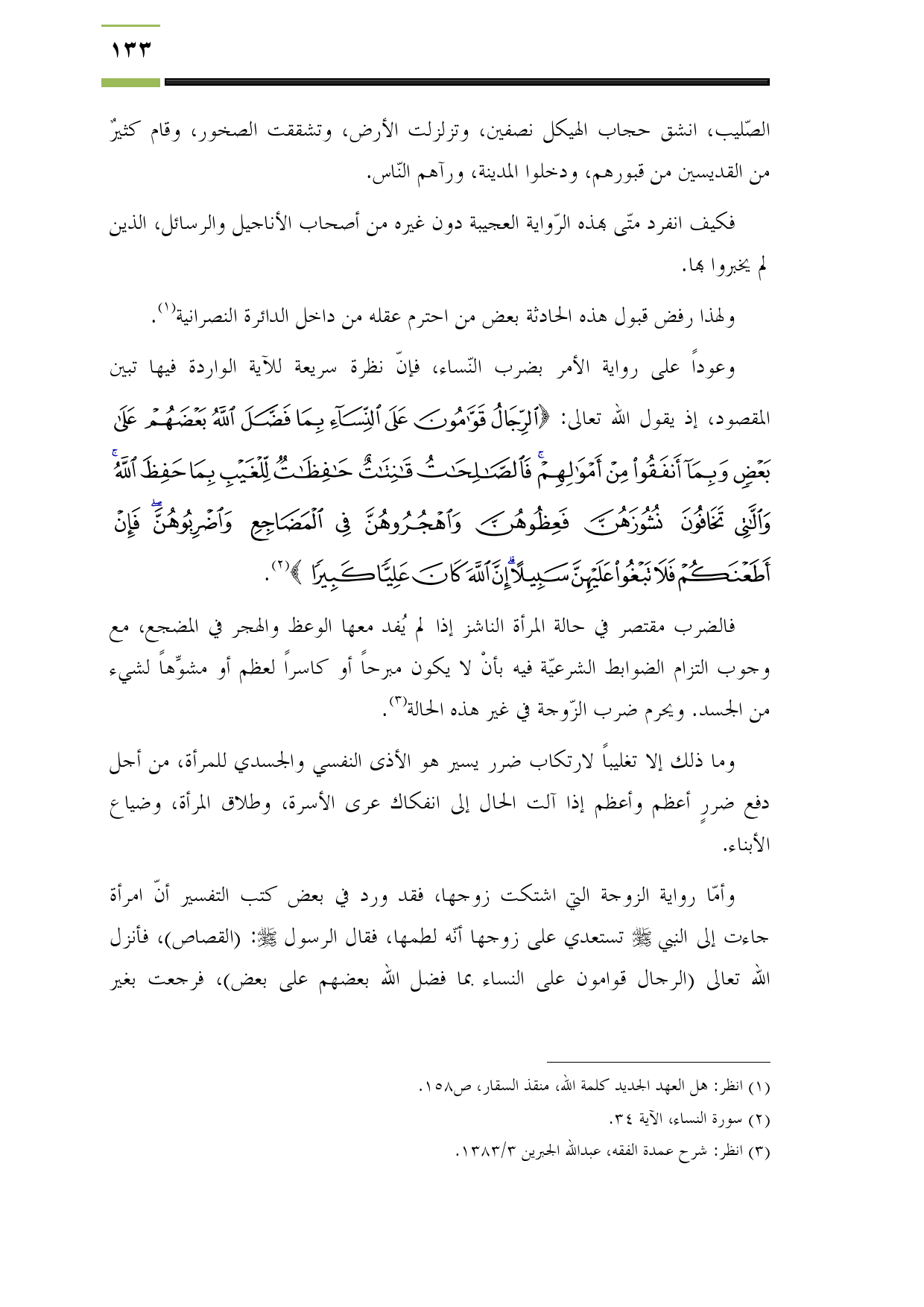 وعوداً على رواية الأمر بضرب النّساء، فإنّ نظرة سريعة للآية الواردة فيها تبين المقصود، إذ يقول الله تعالى: {الرِّجَالُ قَوَّامُونَ عَلَى النِّسَاءِ بِمَا فَضَّلَ اللَّهُ بَعْضَهُمْ عَلَى بَعْضٍ وَبِمَا أَنْفَقُوا مِنْ أَمْوَالِهِمْ فَالصَّالِحَاتُ قَانِتَاتٌ حَافِظَاتٌ لِلْغَيْبِ بِمَا حَفِظَ اللَّهُ وَاللَّاتِي تَخَافُونَ نُشُوزَهُنَّ فَعِظُوهُنَّ وَاهْجُرُوهُنَّ فِي الْمَضَاجِعِ وَاضْرِبُوهُنَّ فَإِنْ أَطَعْنَكُمْ فَلَا تَبْغُوا عَلَيْهِنَّ سَبِيلًا إِنَّ اللَّهَ كَانَ عَلِيًّا كَبِيرًا} (¬2).