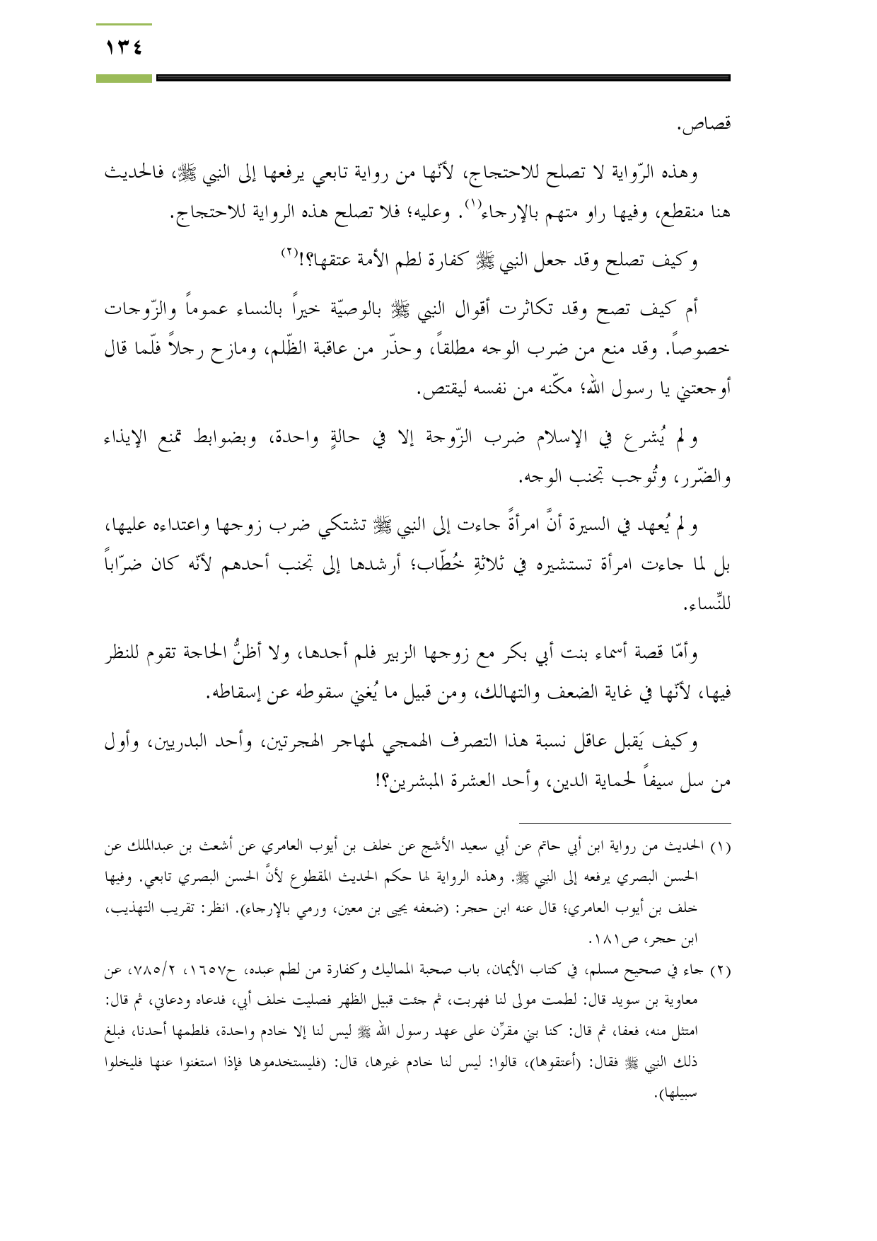 أم كيف تصح وقد تكاثرت أقوال النبي - صلى الله عليه وسلم - بالوصيّة خيراً بالنساء عموماً والزّوجات خصوصاً. وقد منع من ضرب الوجه مطلقاً، وحذّر من عاقبة الظّلم، ومازح رجلاً فلّما قال أوجعتني يا رسول الله؛ مكّنه من نفسه ليقتص.