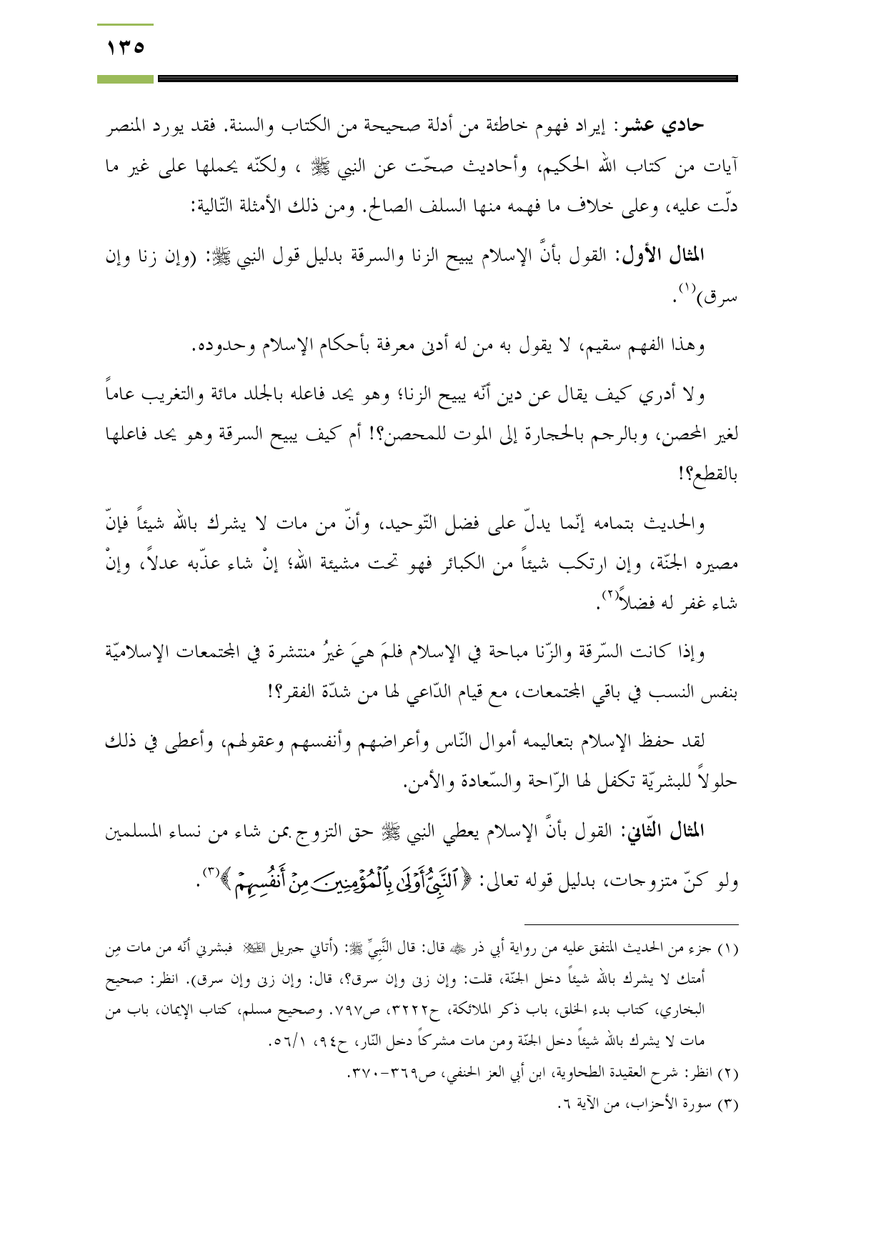 المثال الأول: القول بأنَّ الإسلام يبيح الزنا والسرقة بدليل قول النبي - صلى الله عليه وسلم -: (وإن زنا وإن سرق) (¬1).