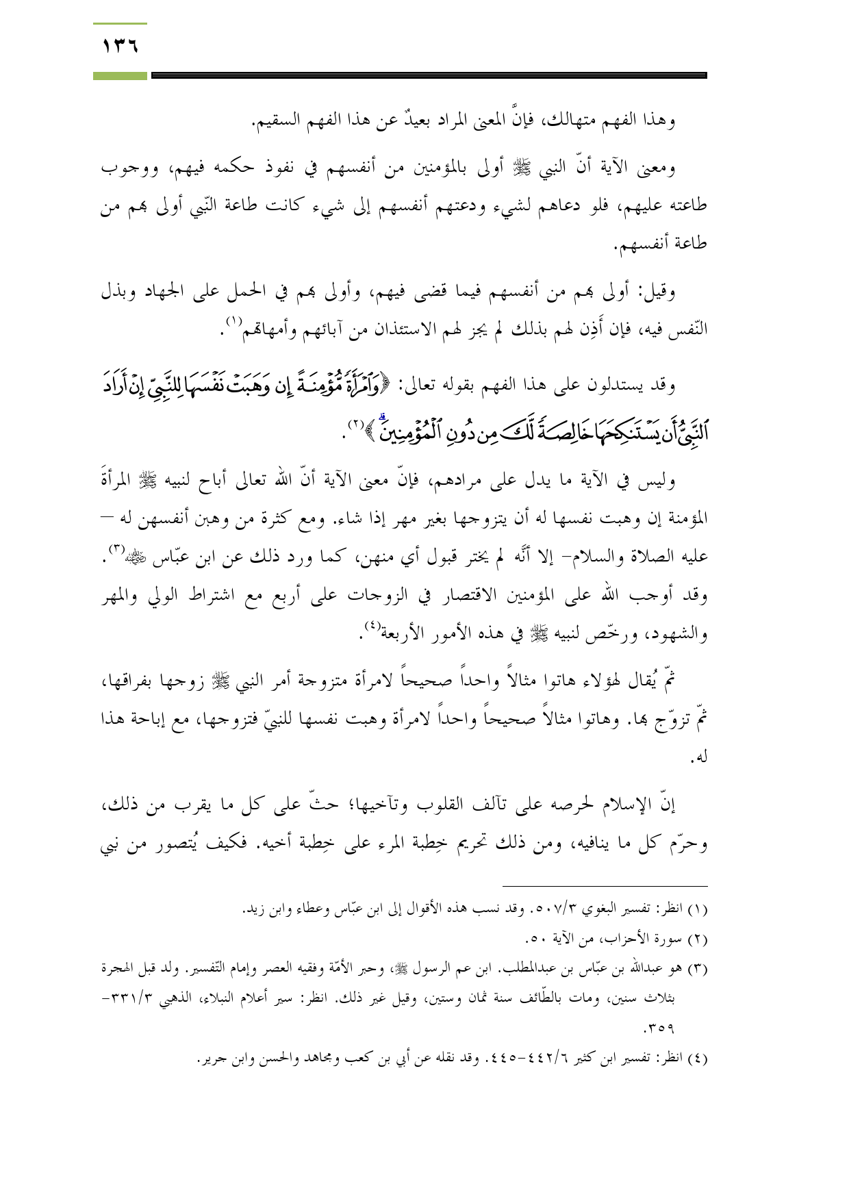 وليس في الآية ما يدل على مرادهم، فإنّ معنى الآية أنّ الله تعالى أباح لنبيه - صلى الله عليه وسلم - المرأةَ المؤمنة إن وهبت نفسها له أن يتزوجها بغير مهر إذا شاء. ومع كثرة من وهبن أنفسهن له -عليه الصلاة والسلام- إلا أنَّه لم يختر قبول أي منهن، كما ورد ذلك عن ابن عبّاس - رضي الله عنه - (¬3). وقد أوجب الله على المؤمنين الاقتصار في الزوجات على أربع مع اشتراط الولي والمهر والشهود، ورخّص لنبيه - صلى الله عليه وسلم - في هذه الأمور الأربعة (¬4).