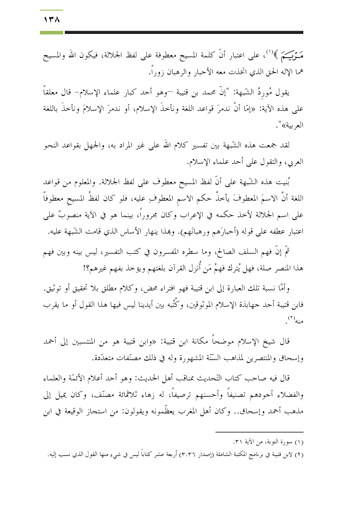 بُنيت هذه الشّبهة على أنّ لفظ المسيح معطوف على لفظ الجلالة. والمعلوم من قواعد اللغة أنَّ الاسمَ المعطوفَ يأخذُ حكم الاسمِ المعطوفِ عليه، فلو كان لفظُ المسيحِ معطوفاً على اسم الجلالة لأخذ حكمه في الإعراب وكان مجروراً، بينما هو في الآية منصوبٌ على اعتبار عطفه على قوله (أحبارَهم ورهبانَهم). وبهذا ينهار الأساس الذي قامت الشّبهة عليه.