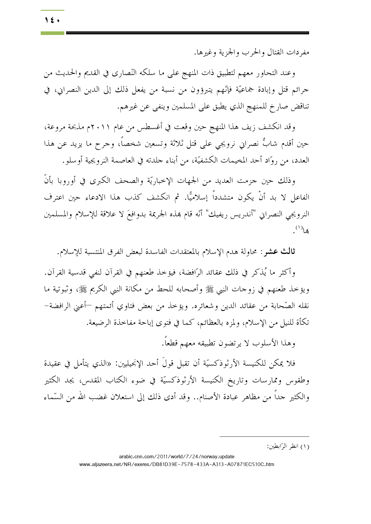 وذلك حين جزمت العديد من الجهات الإخباريّة والصحف الكبرى في أوروبا بأنّ الفاعل لا بد أنْ يكون متشدداً إسلاميًّا. ثم انكشف كذب هذا الادعاء حين اعترف النرويجي النصراني "أندريس ريفيك" أنّه قام بهذه الجريمة بدوافعَ لا علاقة للإسلام والمسلمين بها (¬1).