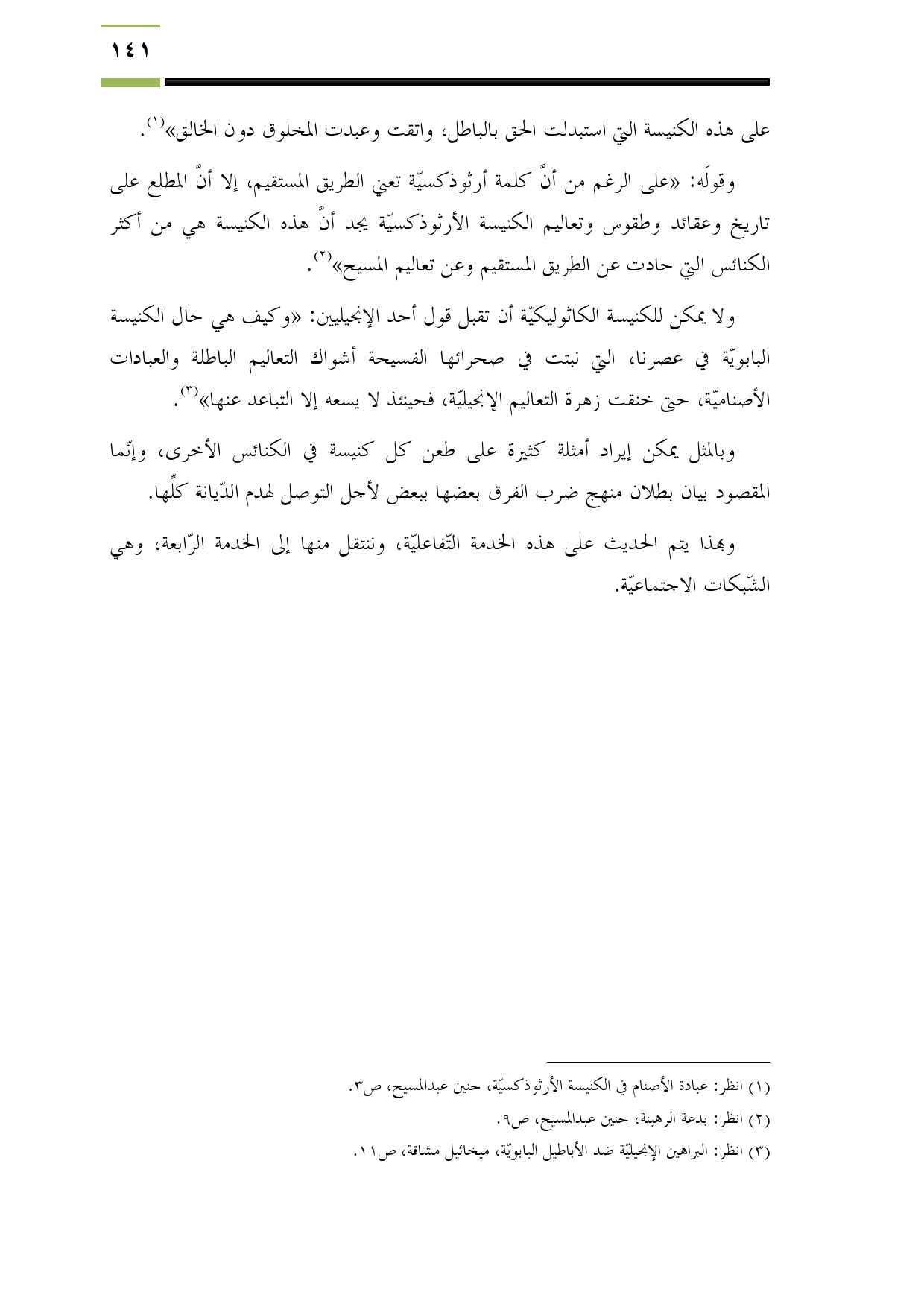 وقولَه: «على الرغم من أنَّ كلمة أرثوذكسيّة تعني الطريق المستقيم، إلا أنَّ المطلع على تاريخ وعقائد وطقوس وتعاليم الكنيسة الأرثوذكسيّة يجد أنَّ هذه الكنيسة هي من أكثر الكنائس التي حادت عن الطريق المستقيم وعن تعاليم المسيح» (¬2).