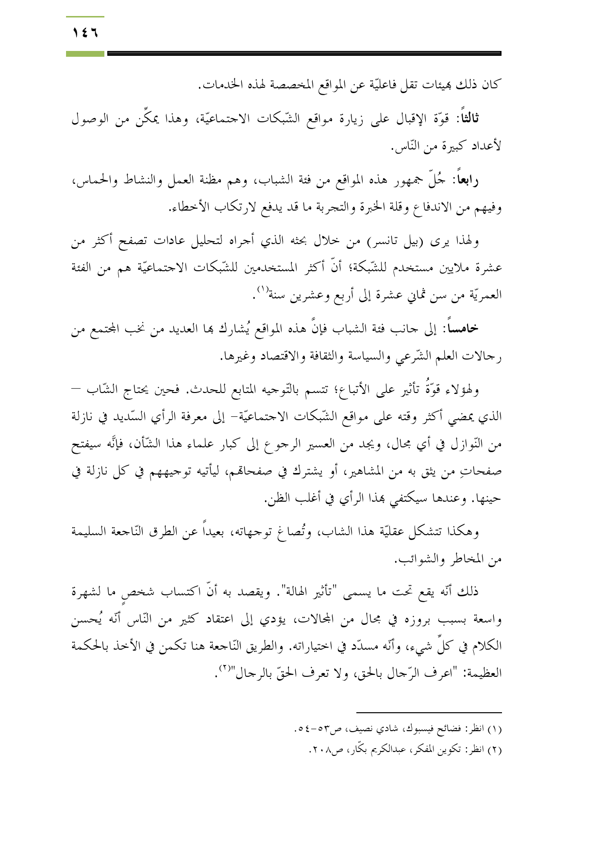 خامساً: إلى جانب فئة الشباب فإنَّ هذه المواقع يُشارك بها العديد من نخب المجتمع من رجالات العلم الشّرعي والسياسة والثقافة والاقتصاد وغيرها.