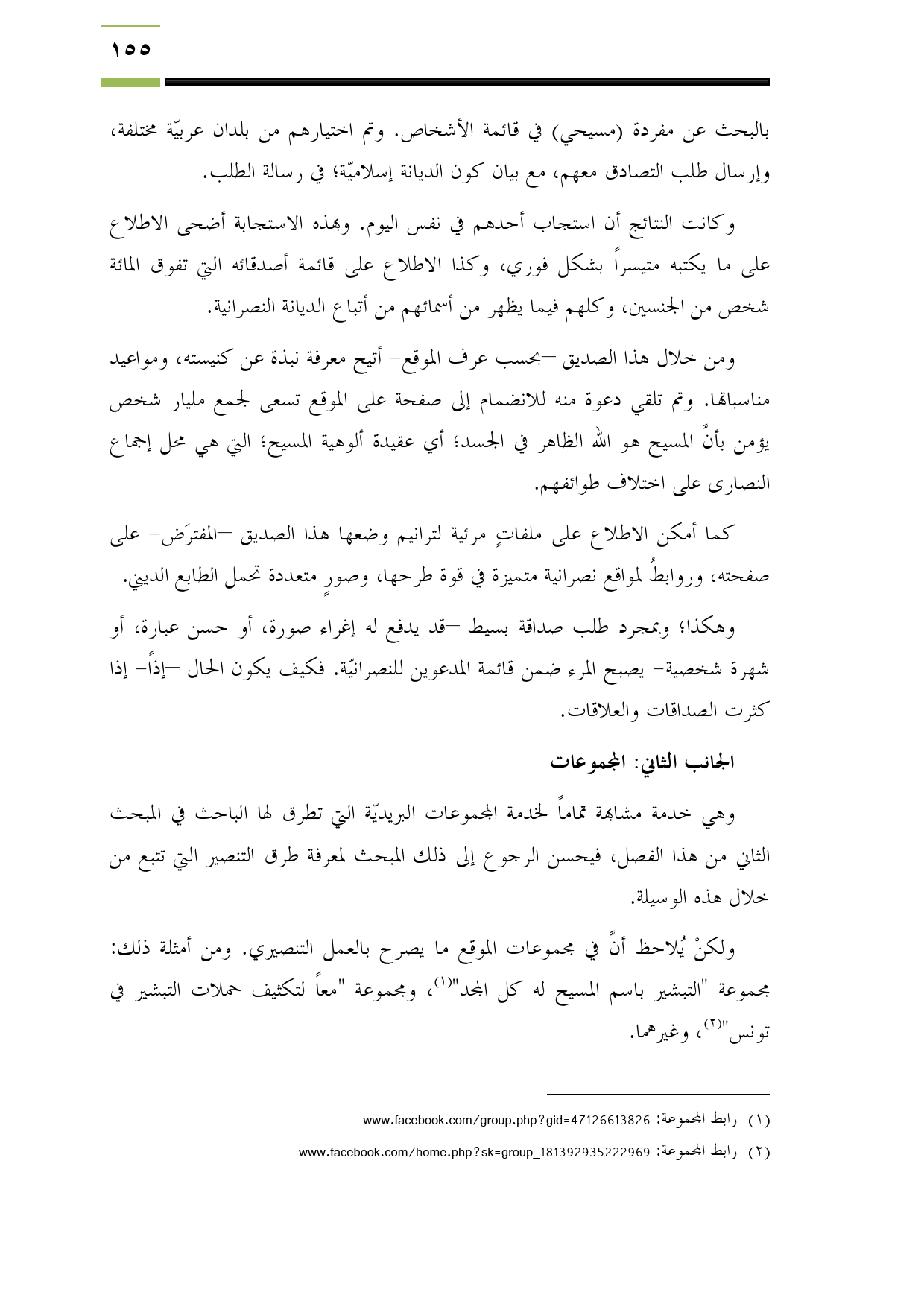 ولكنْ يُلاحظ أنَّ في مجموعات الموقع ما يصرح بالعمل التنصيري. ومن أمثلة ذلك: مجموعة "التبشير باسم المسيح له كل المجد" (¬1)، ومجموعة "معاً لتكثيف حملات التبشير في تونس" (¬2)، وغيرهما.
