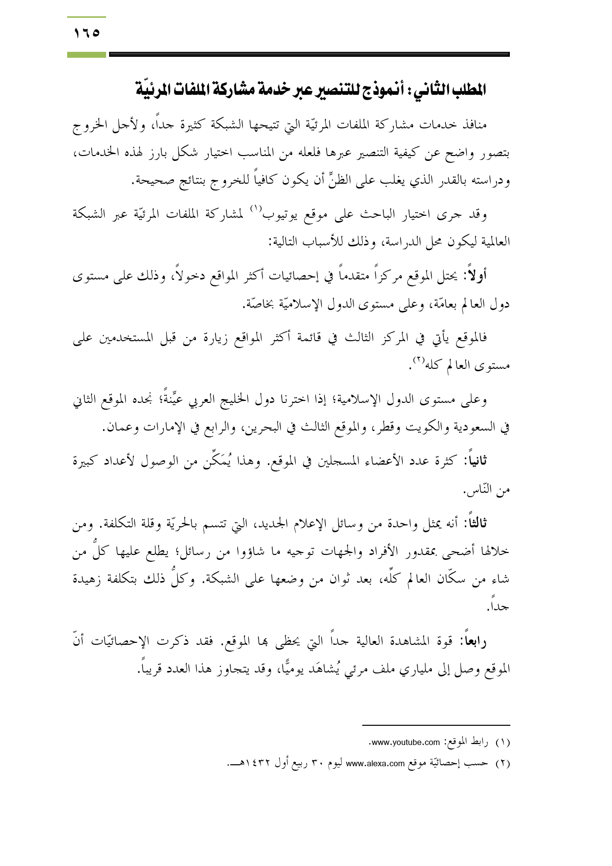 وقد جرى اختيار الباحث على موقع يوتيوب (¬1) لمشاركة الملفات المرئيّة عبر الشبكة العالمية ليكون محل الدراسة، وذلك للأسباب التالية: