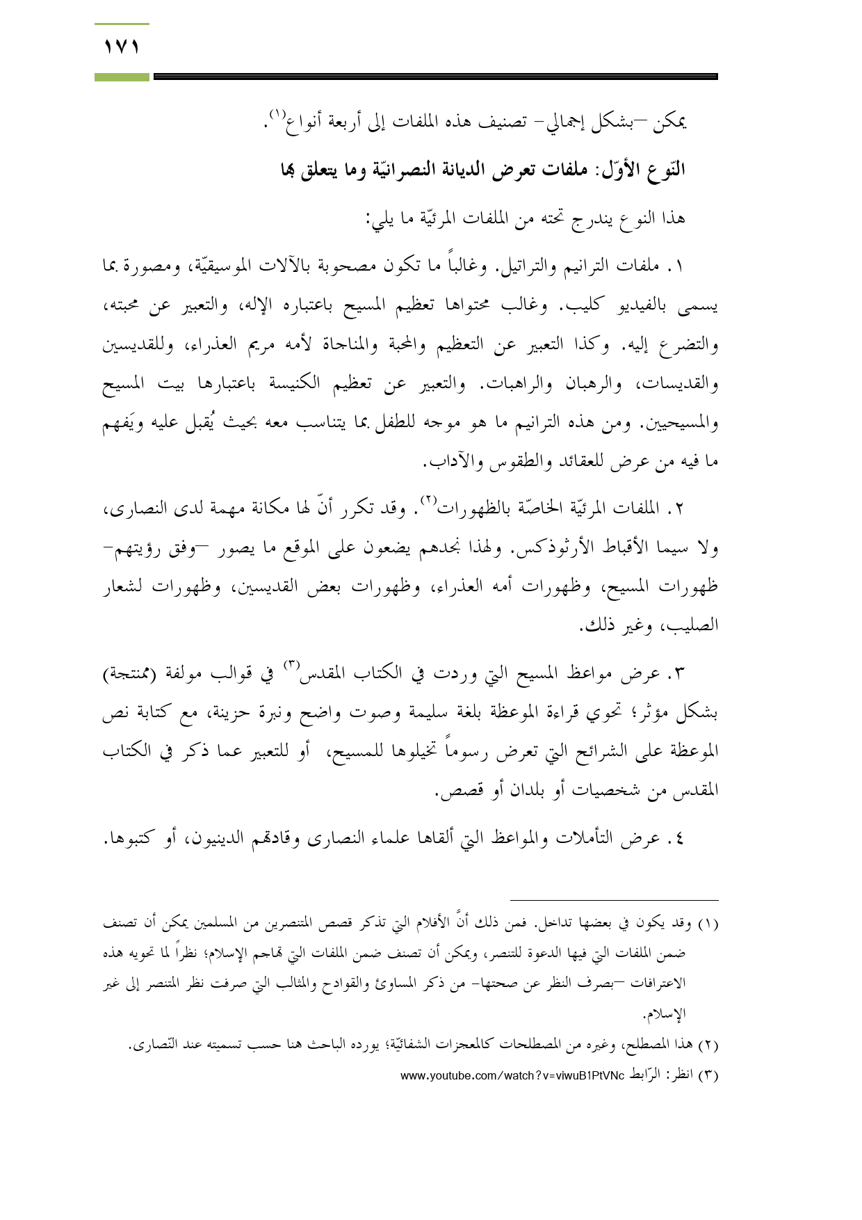 (¬1) وقد يكون في بعضها تداخل. فمن ذلك أنَّ الأفلام التي تذكر قصص المتنصرين من المسلمين يمكن أن تصنف ضمن الملفات التي فيها الدعوة للتنصر، ويمكن أن تصنف ضمن الملفات التي تهاجم الإسلام؛ نظراً لما تحويه هذه الاعترافات -بصرف النظر عن صحتها- من ذكر المساوئ والقوادح والمثالب التي صرفت نظر المتنصر إلى غير الإسلام.