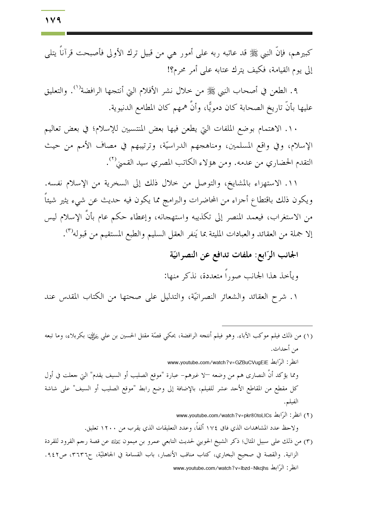 9. الطعن في أصحاب النبي - صلى الله عليه وسلم - من خلال نشر الأفلام التي أنتجها الرافضة (¬1). والتعليق عليها بأنّ تاريخ الصحابة كان دمويًّا، وأنَّ همهم كان المطامع الدنيوية.