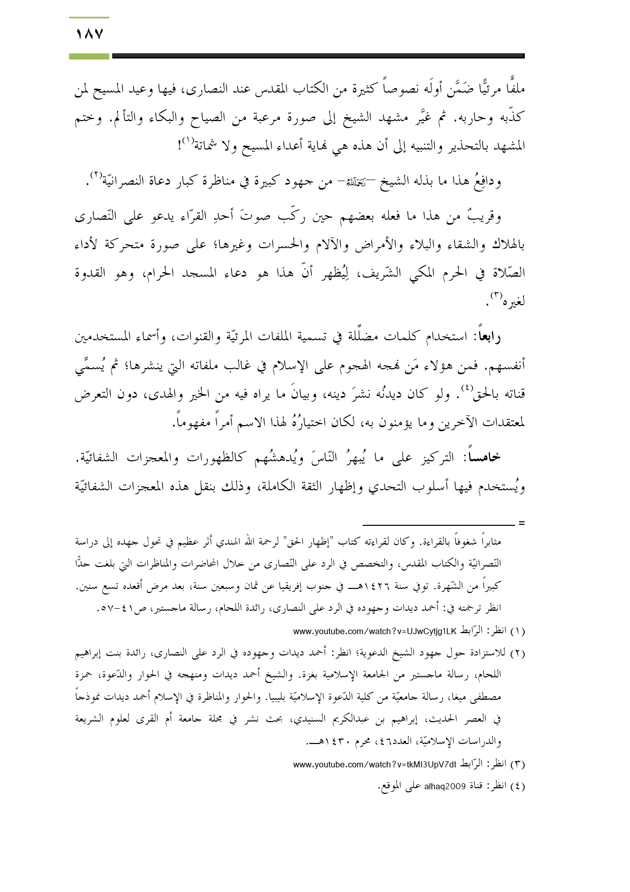 (¬2) للاستزادة حول جهود الشيخ الدعوية؛ انظر: أحمد ديدات وجهوده في الرد على النصارى، رائدة بنت إبراهيم اللحام، رسالة ماجستير من الجامعة الإسلامية بغزة. والشيخ أحمد ديدات ومنهجه في الحوار والدّعوة، حمزة مصطفى ميغا، رسالة جامعيّة من كلية الدّعوة الإسلاميّة بليبيا. والحوار والمناظرة في الإسلام أحمد ديدات نموذجاً في العصر الحديث، إبراهيم بن عبد الكريم السنيدي، بحث نشر في مجلة جامعة أم القرى لعلوم الشريعة والدراسات الإسلاميّة، العدد46، محرم 1430هـ.