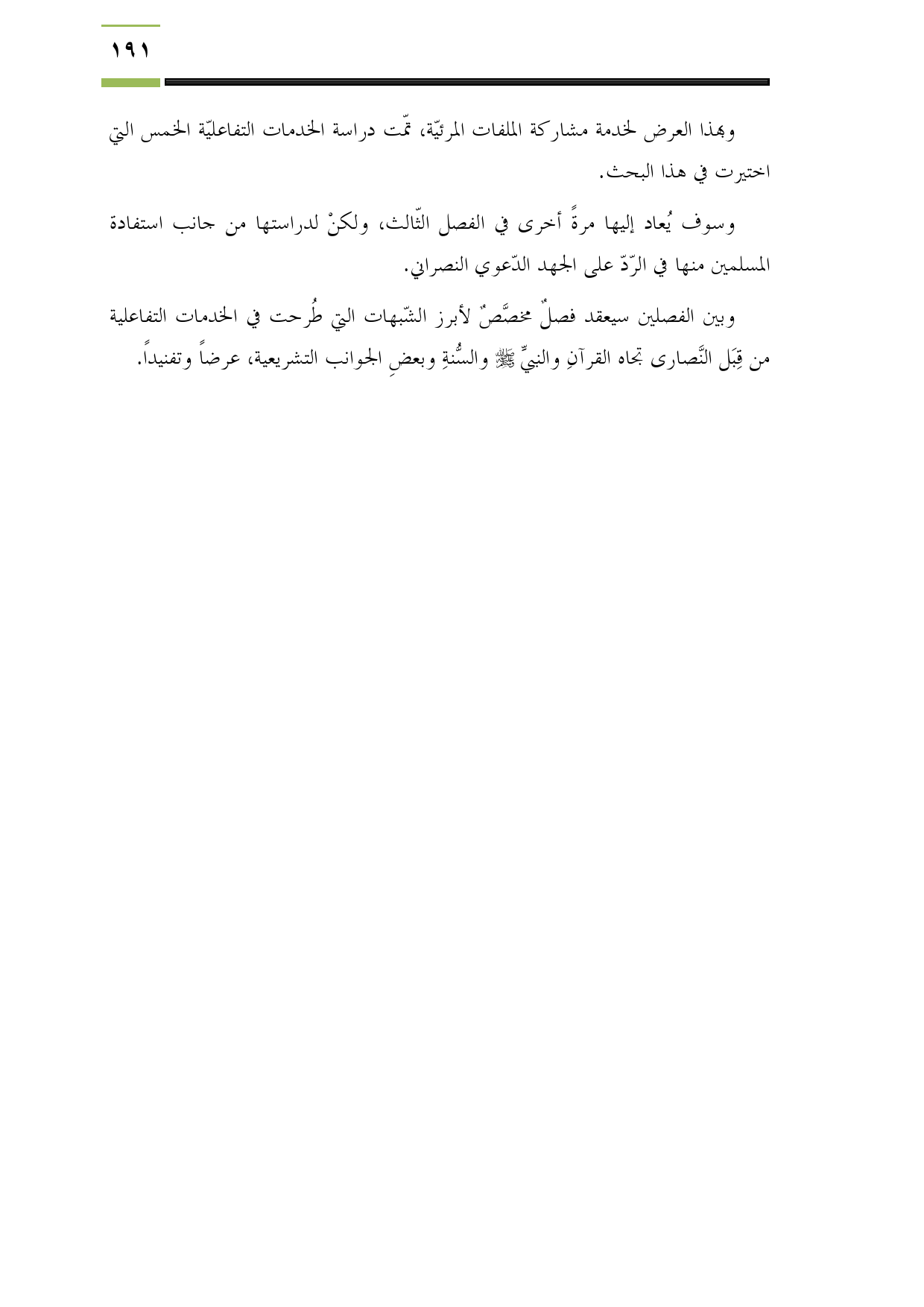وبين الفصلين سيعقد فصلٌ مخصَّصٌ لأبرز الشّبهات التي طُرحت في الخدمات التفاعلية من قِبَل النَّصارى تجاه القرآنِ والنبيِّ - صلى الله عليه وسلم - والسُّنةِ وبعضِ الجوانب التشريعية، عرضاً وتفنيداً.