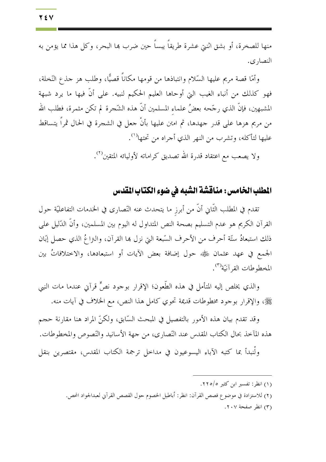 وأمّا قصة مريم عليها السّلام وانتباذها من قومها مكاناً قصيًّا، وطلب هز جذع النّخلة، فهو كذلك من أنباء الغيب التي أوحاها العليم الحكيم لنبيه. على أنّ فيها ما يرد شبهة المشبهين، فإنّ الذي رجّحه بعضُ علماءِ المسلمين أنّ هذه الشّجرة لم تكن مثمرة، فطلب الله من مريم هزها على قدر جهدها، ثم امتن عليها بأنْ جعل في الشجرة في الحال ثمراً يتساقط عليها لتأكله، وتشرب من النهر الذي أجراه من تحتها (¬1).