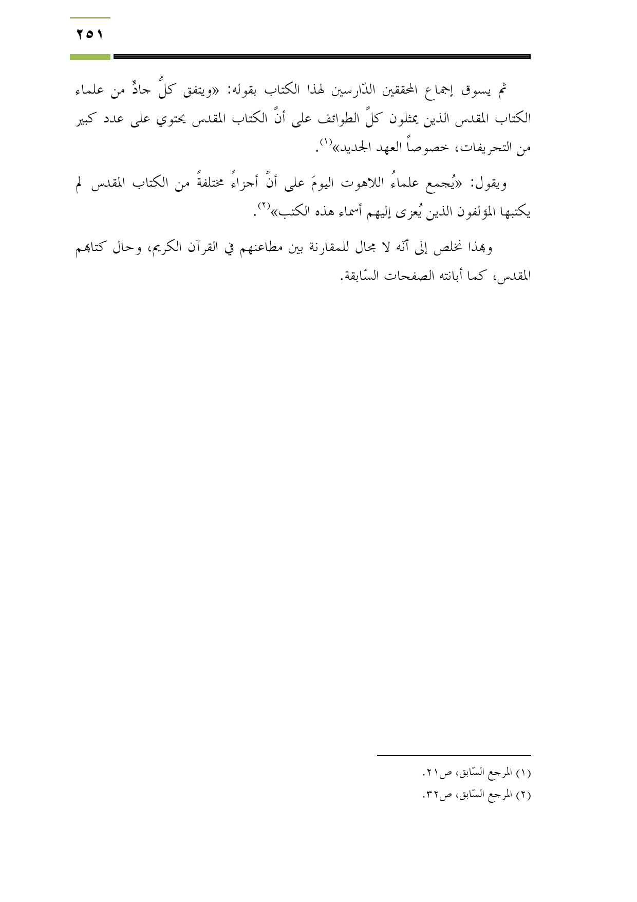 ثم يسوق إجماع المحققين الدّارسين لهذا الكتاب بقوله: «ويتفق كلُّ جادٍّ من علماء الكتاب المقدس الذين يمثلون كلَّ الطوائف على أنَّ الكتاب المقدس يحتوي على عدد كبير من التحريفات، خصوصاً العهد الجديد» (¬1).