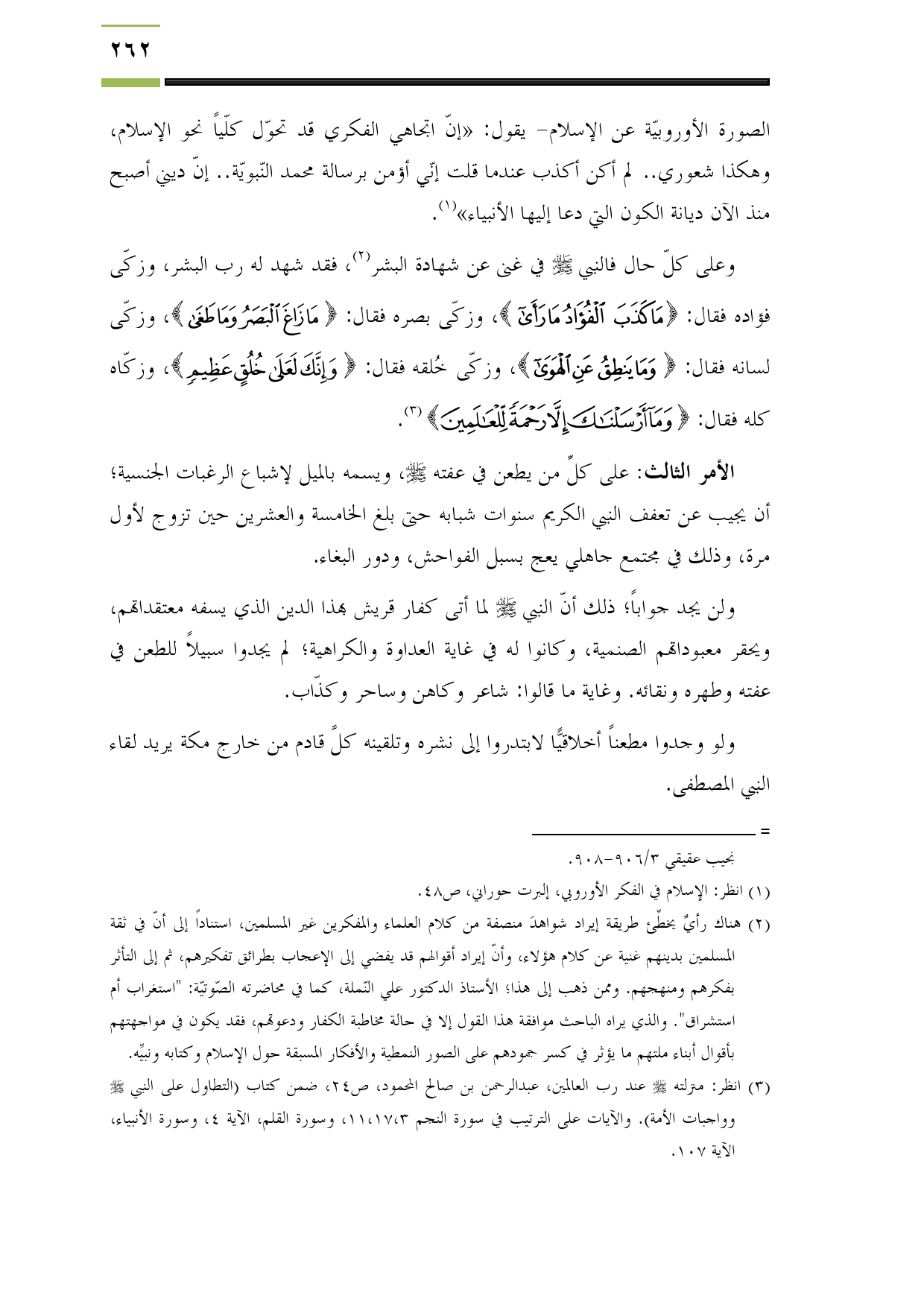 (¬3) انظر: منزلته - صلى الله عليه وسلم - عند رب العالمين، عبد الرحمن بن صالح المحمود، ص24، ضمن كتاب (التطاول على النبي - صلى الله عليه وسلم - وواجبات الأمة). والآيات على الترتيب في سورة النجم 11،17،3، وسورة القلم، الآية 4، وسورة الأنبياء، الآية 107.