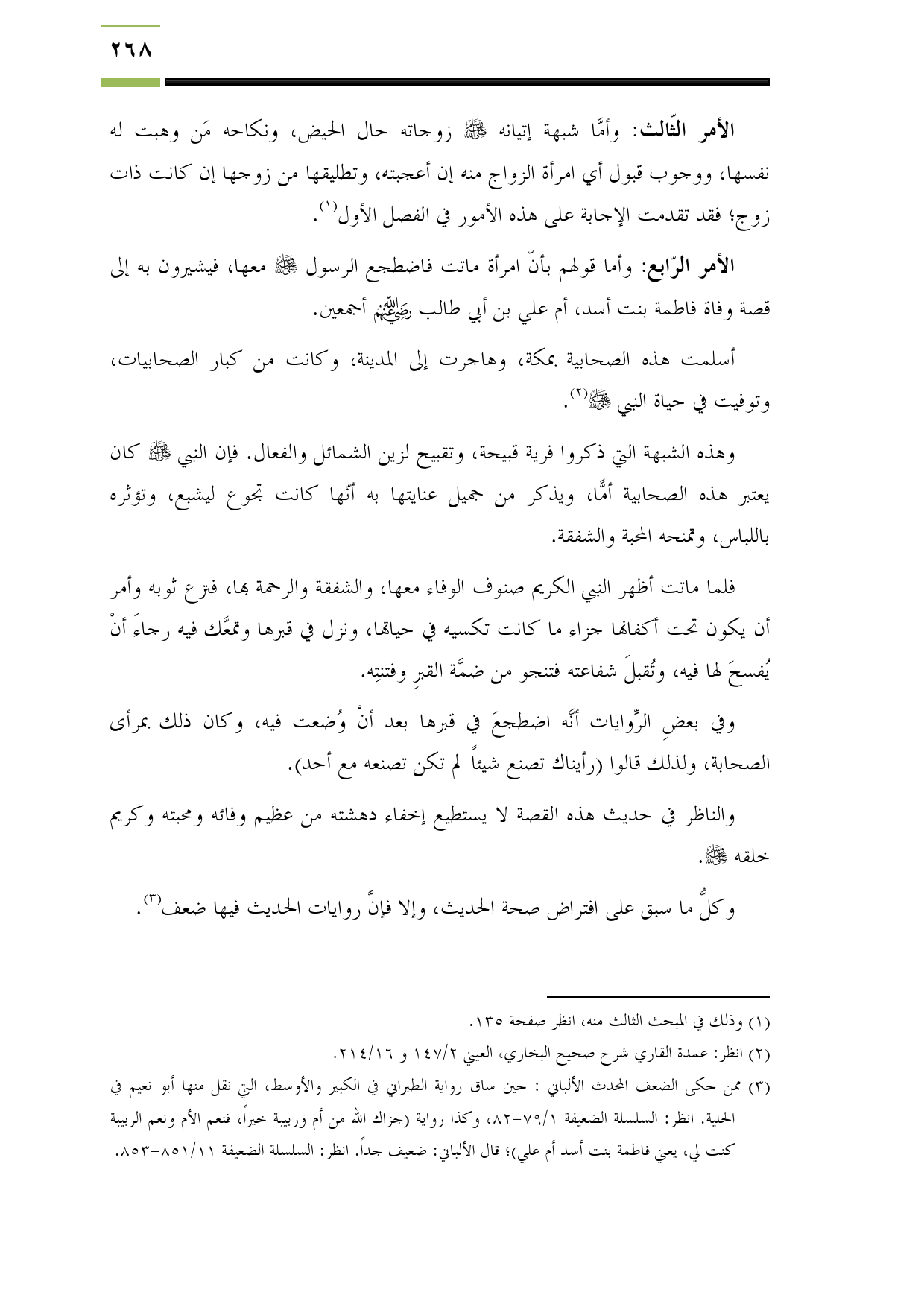 الأمر الرّابع: وأما قولهم بأنّ امرأة ماتت فاضطجع الرسول - صلى الله عليه وسلم - معها، فيشيرون به إلى قصة وفاة فاطمة بنت أسد، أم علي بن أبي طالب ? أجمعين.