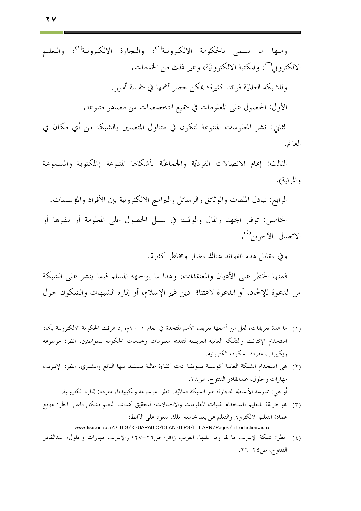 ومنها ما يسمى بالحكومة الالكترونية (¬1)، والتجارة الالكترونية (¬2)، والتعليم الالكتروني (¬3)، والمكتبة الالكترونيّة، وغير ذلك من الخدمات.