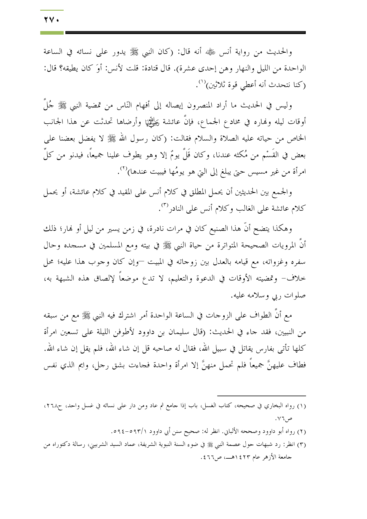 وليس في الحديث ما أراد المنصرون إيصاله إلى أفهام النّاس من تمضية النبي - صلى الله عليه وسلم - جُلَّ أوقات ليله ونهاره في مخادع الجماع، فإنَّ عائشة ? وأرضاها تحدثت عن هذا الجانب الخاص من حياته عليه الصلاة والسلام فقالت: (كان رسول الله - صلى الله عليه وسلم - لا يفضل بعضنا على