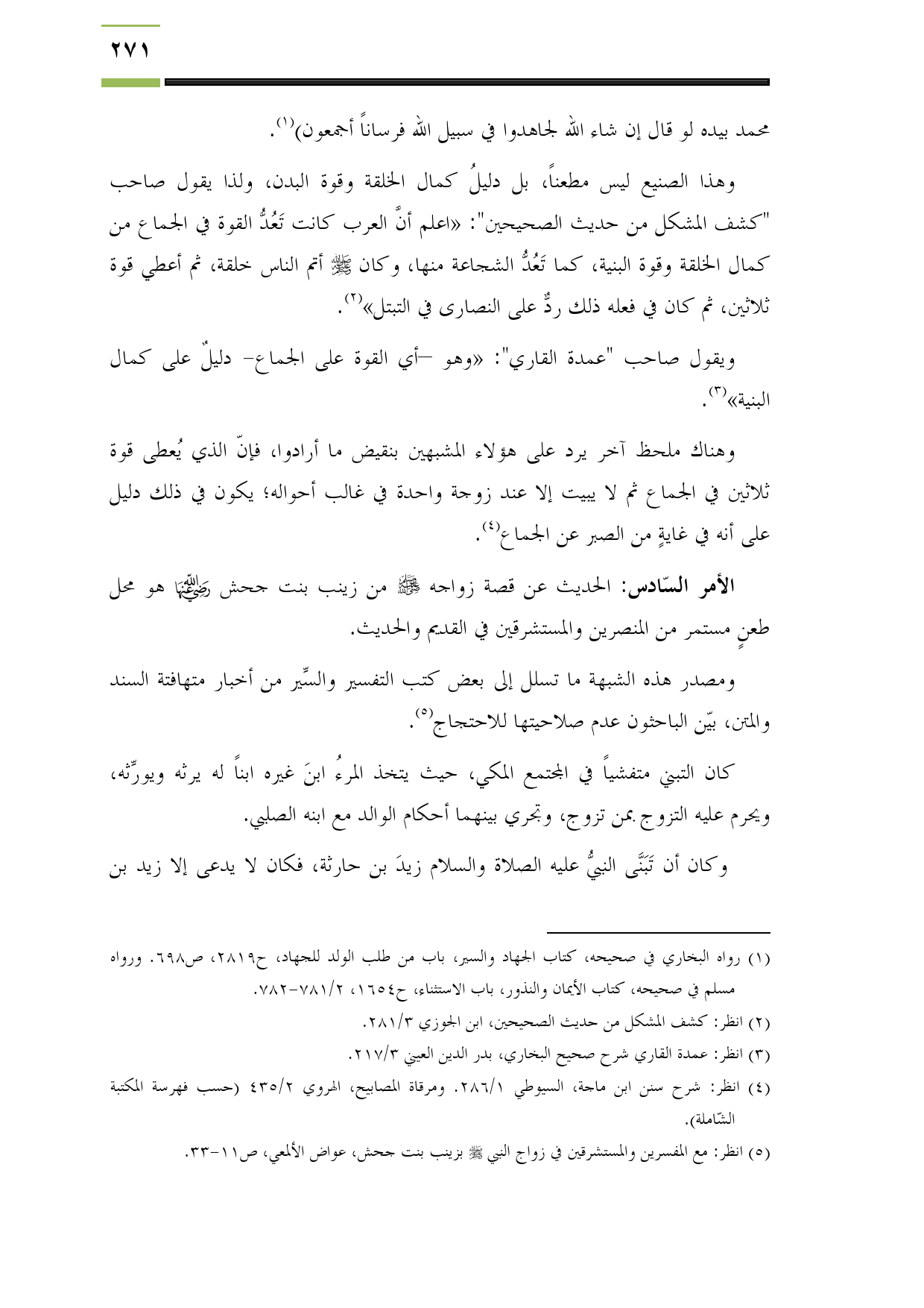 وهناك ملحظ آخر يرد على هؤلاء المشبهين بنقيض ما أرادوا، فإنّ الذي يُعطى قوة ثلاثين في الجماع ثم لا يبيت إلا عند زوجة واحدة في غالب أحواله؛ يكون في ذلك دليل على أنه في غايةٍ من الصبر عن الجماع (¬4).