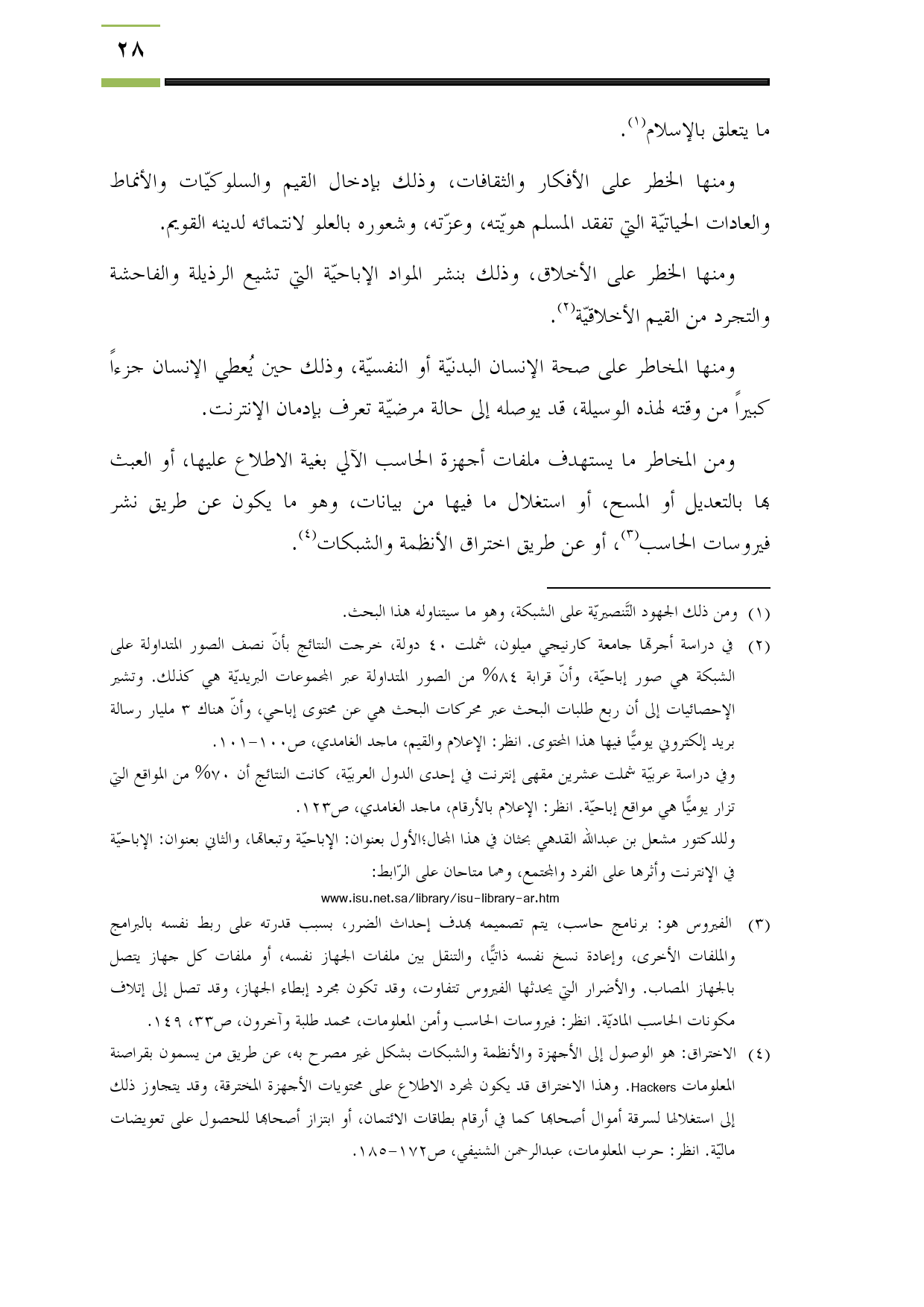(¬2) في دراسة أجرتها جامعة كارنيجي ميلون، شملت 40 دولة، خرجت النتائج بأنّ نصف الصور المتداولة على الشبكة هي صور إباحيّة، وأنّ قرابة 84% من الصور المتداولة عبر المجموعات البريديّة هي كذلك. وتشير الإحصائيات إلى أن ربع طلبات البحث عبر محركات البحث هي عن محتوى إباحي، وأنّ هناك 3 مليار رسالة بريد إلكتروني يوميًّا فيها هذا المحتوى. انظر: الإعلام والقيم، ماجد الغامدي، ص100 - 101.
