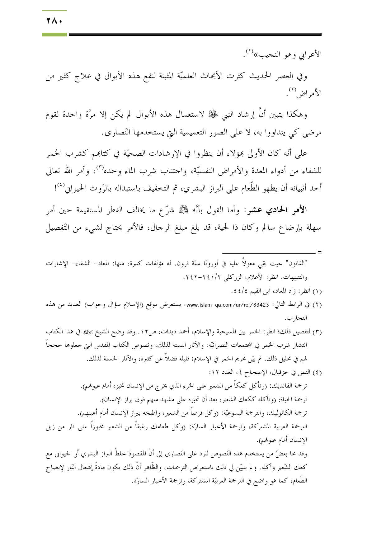 على أنّه كان الأولى بهؤلاء أن ينظروا في الإرشادات الصحيّة في كتابهم كشرب الخمر للشفاء من أدواء المعدة والأمراض النفسيّة، واجتناب شرب الماء وحده (¬3)، وأمر الله تعالى أحد أنبيائه أن يطهو الطّعام على البراز البشري، ثم التخفيف باستبداله بالرّوث الحيواني (¬4)!