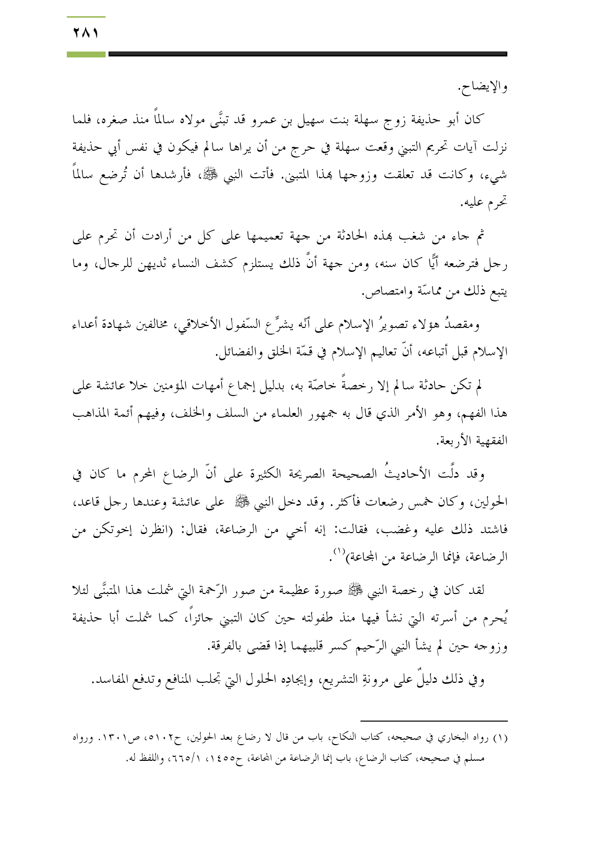 (¬1) رواه البخاري في صحيحه، كتاب النكاح، باب من قال لا رضاع بعد الحولين، ح5102، ص1301. ورواه مسلم في صحيحه، كتاب الرضاع، باب إنما الرضاعة من المجاعة، ح1455، 1/ 665، واللفظ له.