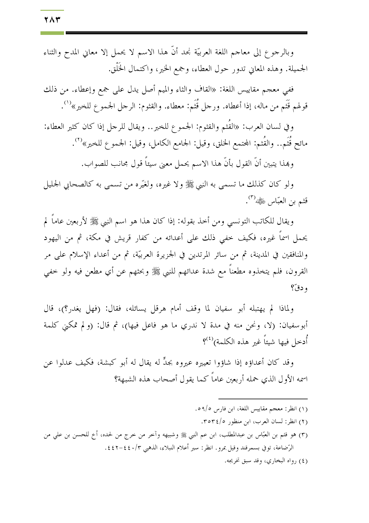 ولو كان كذلك ما تسمى به النبي - صلى الله عليه وسلم - ولا غيره، ولغيّره من تسمى به كالصحابي الجليل قثم بن العبّاس - رضي الله عنه - (¬3).