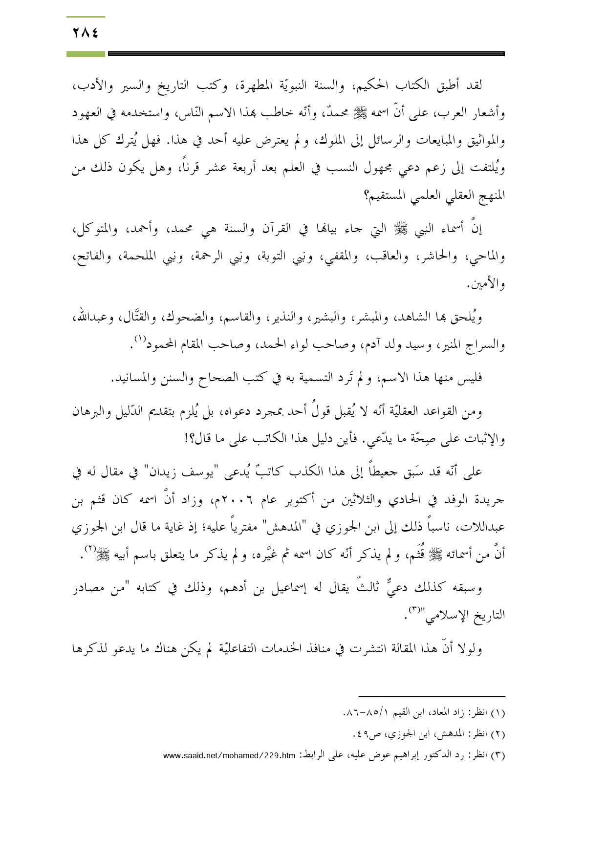 لقد أطبق الكتاب الحكيم، والسنة النبويّة المطهرة، وكتب التاريخ والسير والأدب، وأشعار العرب، على أنّ اسمه - صلى الله عليه وسلم - محمدٌ، وأنّه خاطب بهذا الاسم النّاس، واستخدمه في العهود والمواثيق والمبايعات والرسائل إلى الملوك، ولم يعترض عليه أحد في هذا. فهل يُترك كل هذا ويُلتفت إلى زعم دعي مجهول النسب في العلم بعد أربعة عشر قرناً، وهل يكون ذلك من المنهج العقلي العلمي المستقيم؟