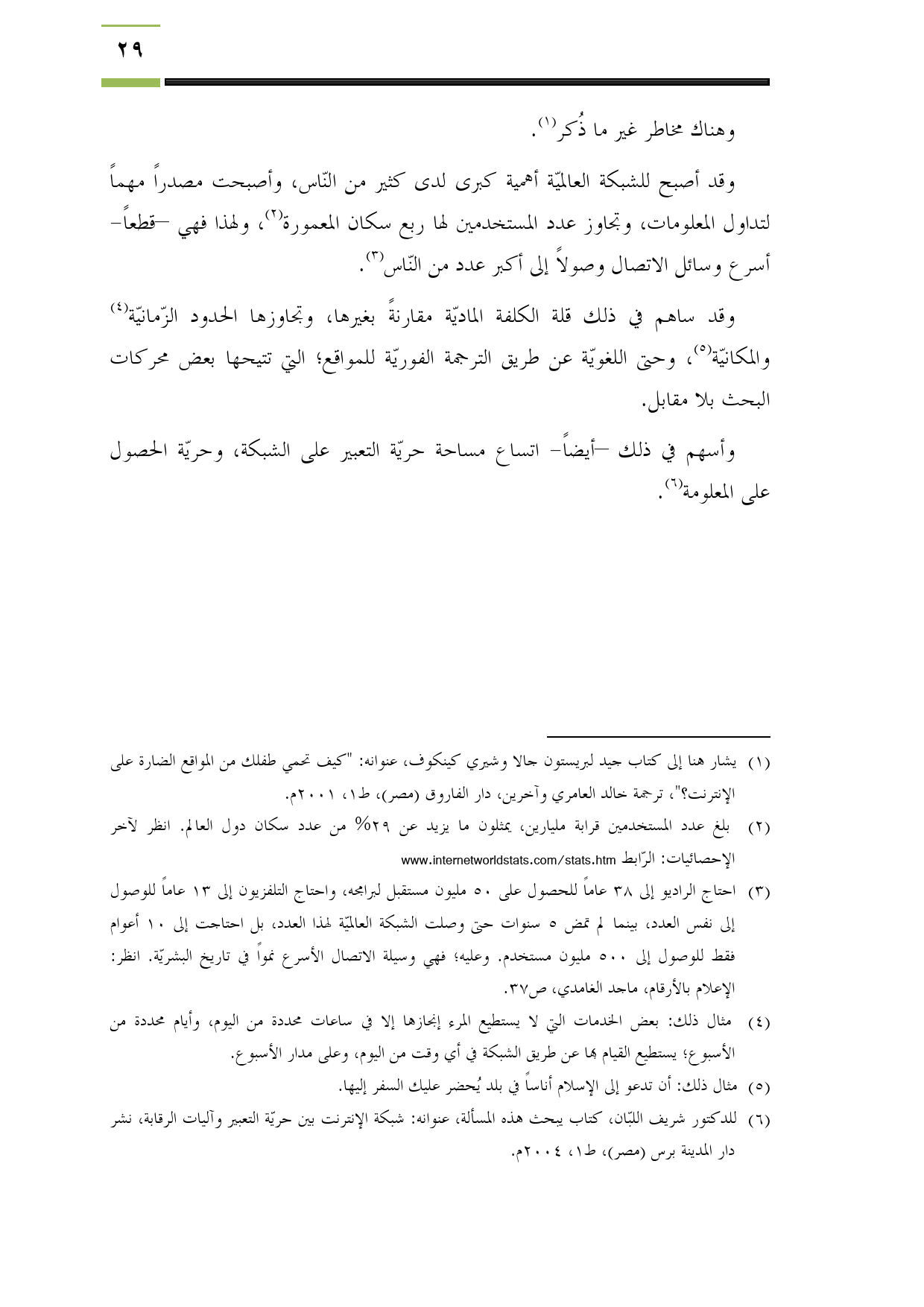 (¬2) بلغ عدد المستخدمين قرابة مليارين، يمثلون ما يزيد عن 29% من عدد سكان دول العالم. انظر لآخر الإحصائيات: الرّابط www.internetworldstats.com/stats.htm