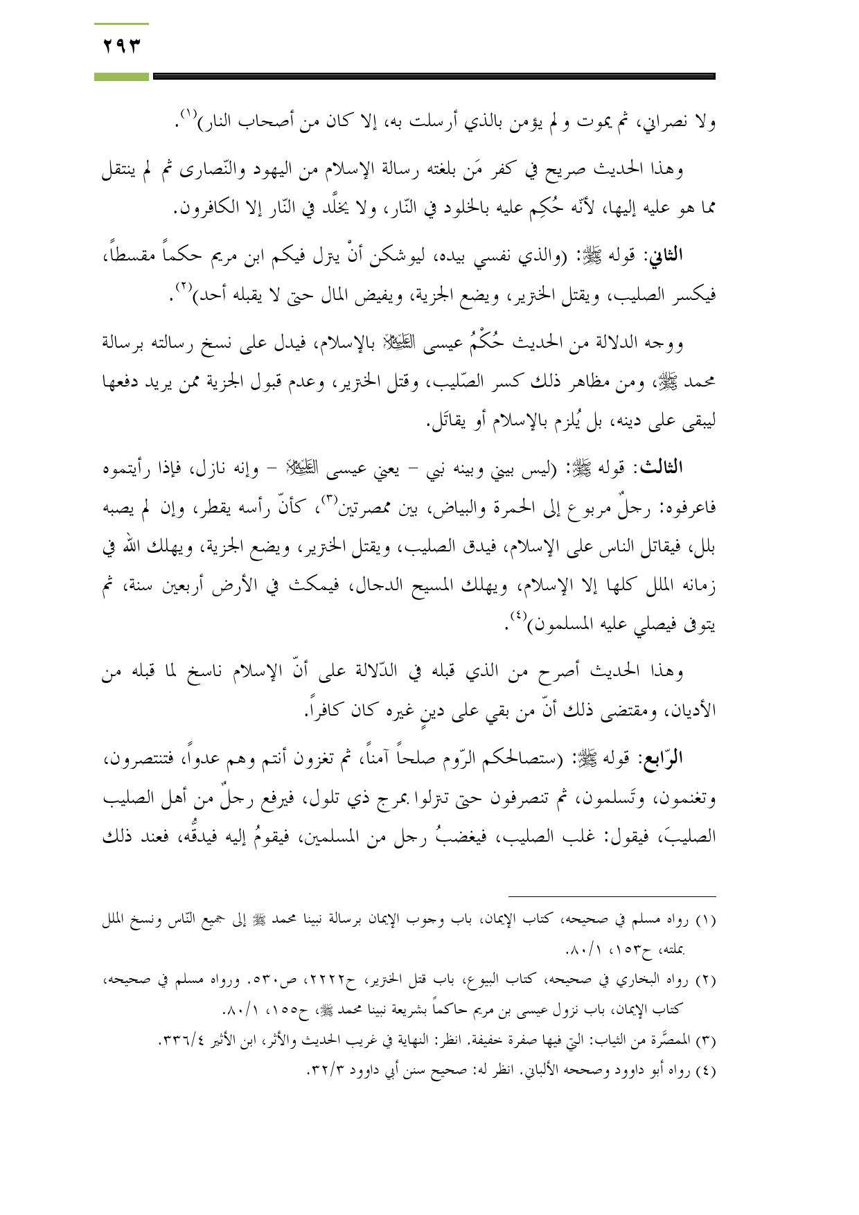 ووجه الدلالة من الحديث حُكْمُ عيسى - عليه السلام - بالإسلام، فيدل على نسخ رسالته برسالة محمد - صلى الله عليه وسلم -، ومن مظاهر ذلك كسر الصّليب، وقتل الخنزير، وعدم قبول الجزية ممن يريد دفعها ليبقى على دينه، بل يُلزم بالإسلام أو يقاتَل.