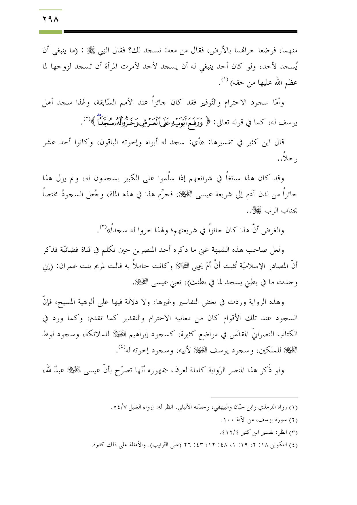 وأمّا سجود الاحترام والتّوقير فقد كان جائزاً عند الأمم السّابقة، ولهذا سجد أهل يوسف له، كما في قوله تعالى: {وَرَفَعَ أَبَوَيْهِ عَلَى الْعَرْشِ وَخَرُّوا لَهُ سُجَّدًا} (¬3).